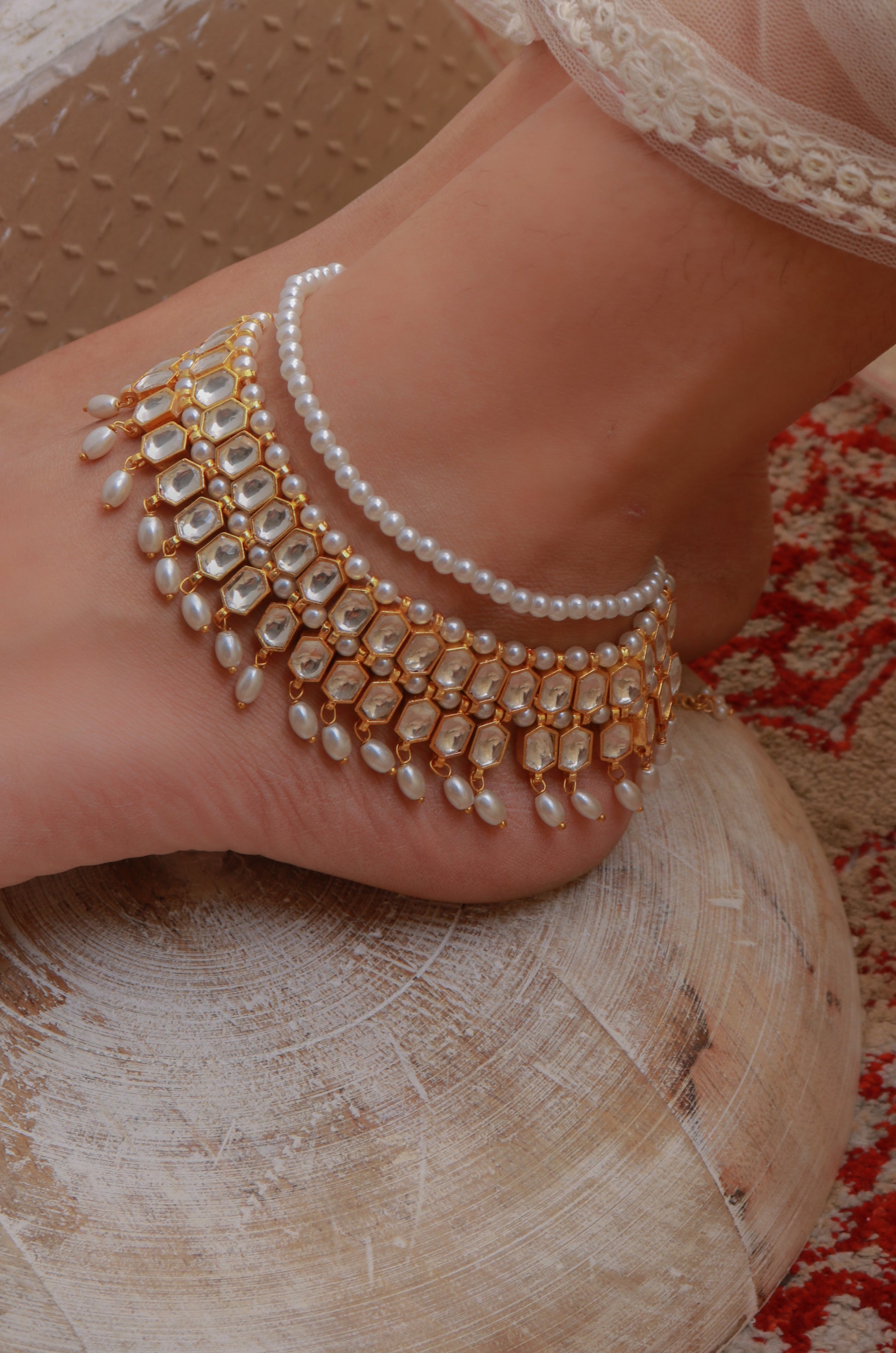 This beautiful anklet, crafted with Kundan and pearls, exudes a royal vibe, making it a perfect addition to a wedding trousseau, blending traditional elegance with timeless sophistication.