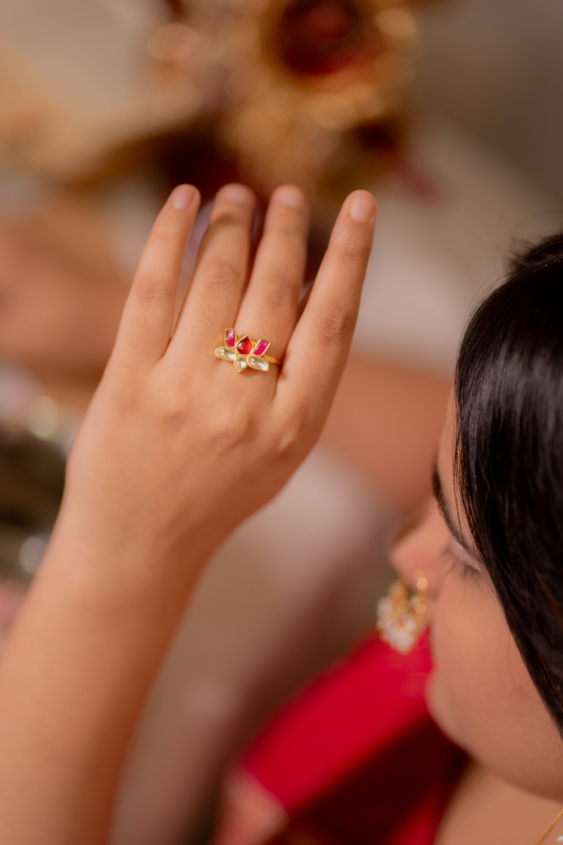 This exquisite pink Kundan ring features a delicate lotus-shaped motif, blending traditional elegance with modern charm. Handcrafted with intricate detailing, it radiates grace, beauty, and timeless allure.