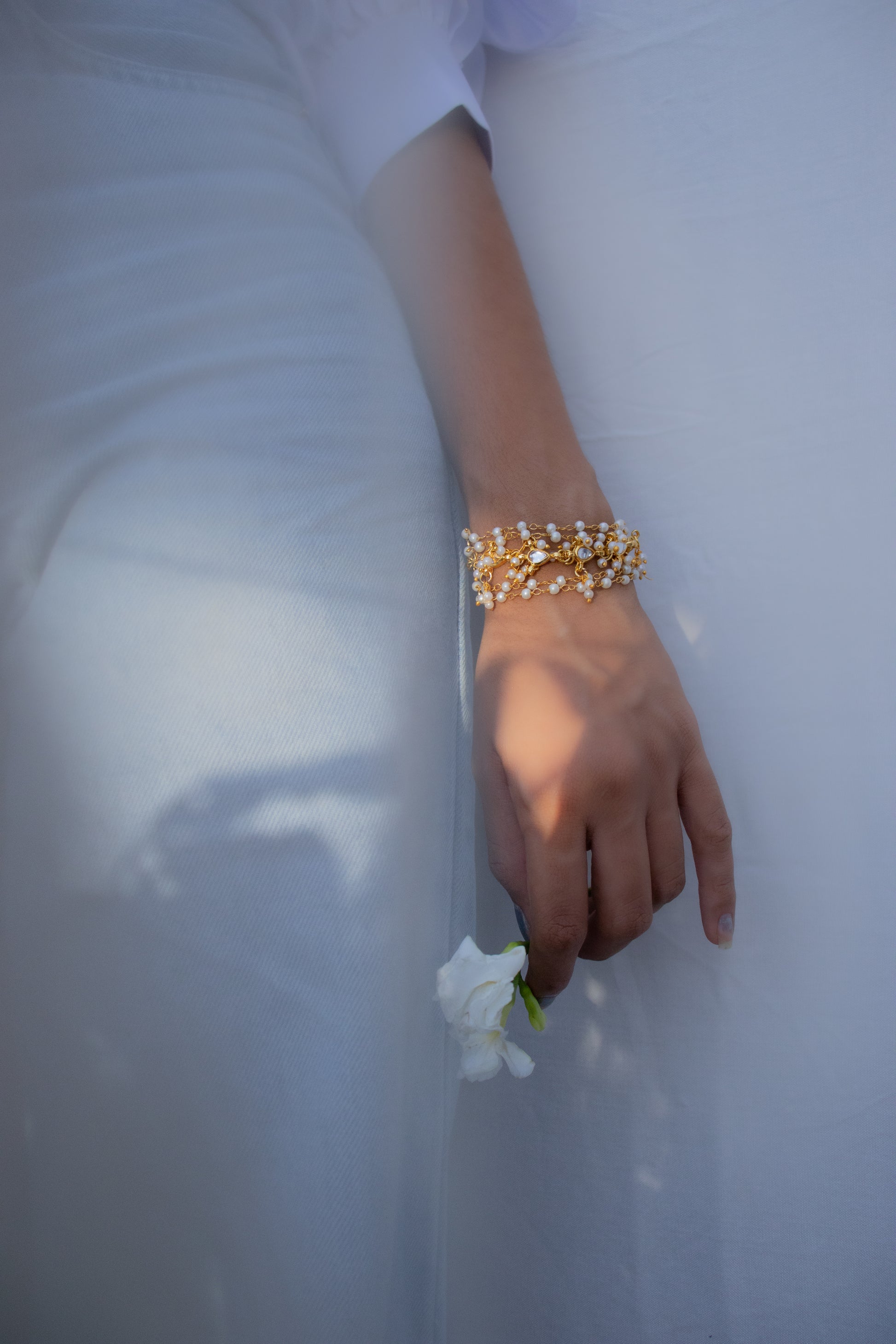 This beautiful bracelet features oodles of pearls frivolously dangling throughout its length. The kundan units add a touch of glam to the design.