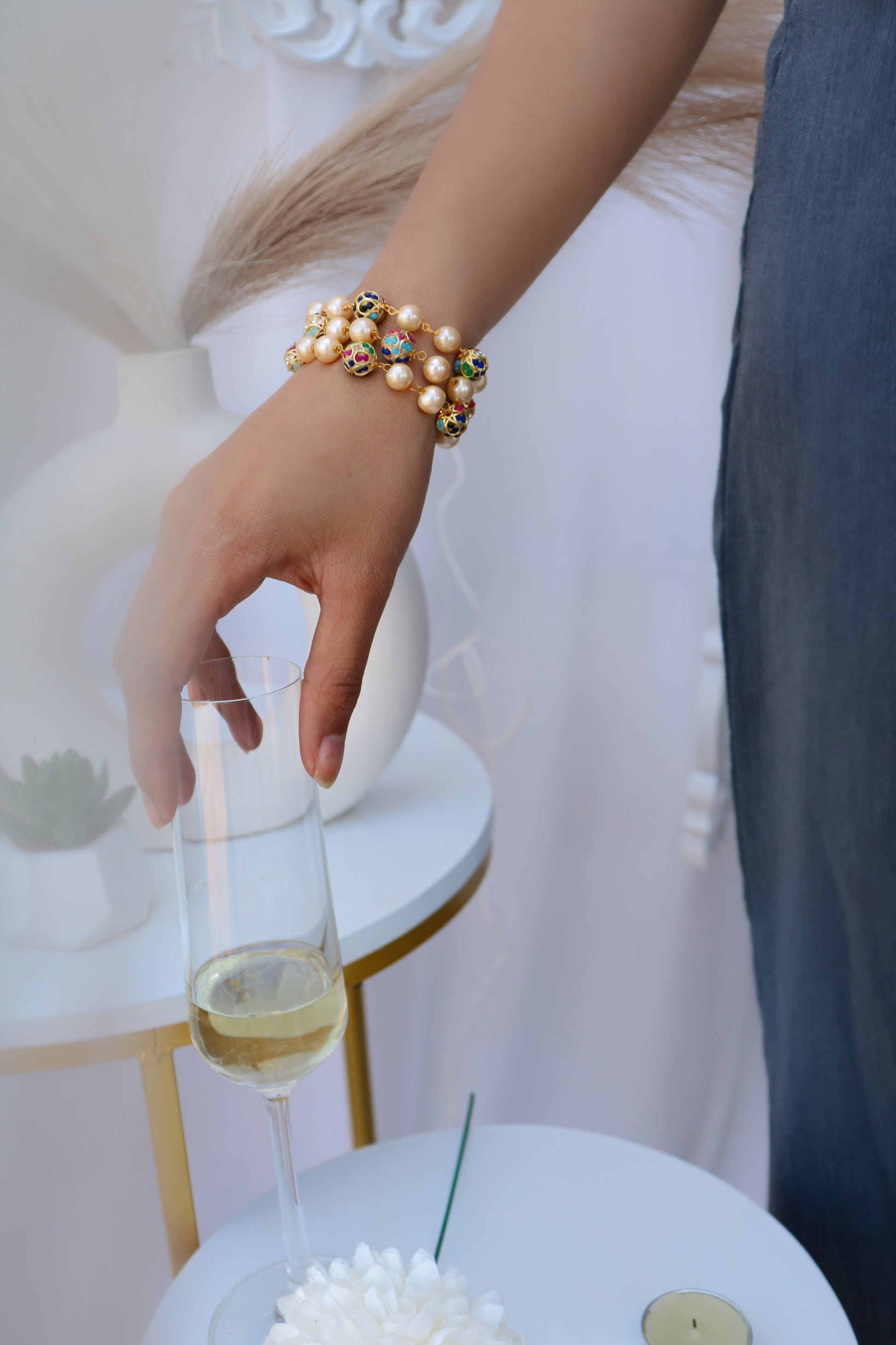 This kundan bracelet is a lovely jewel to own, the bracelet features pearls and an array of colors. The design offers a versatile design that can be paired with almost everything.
