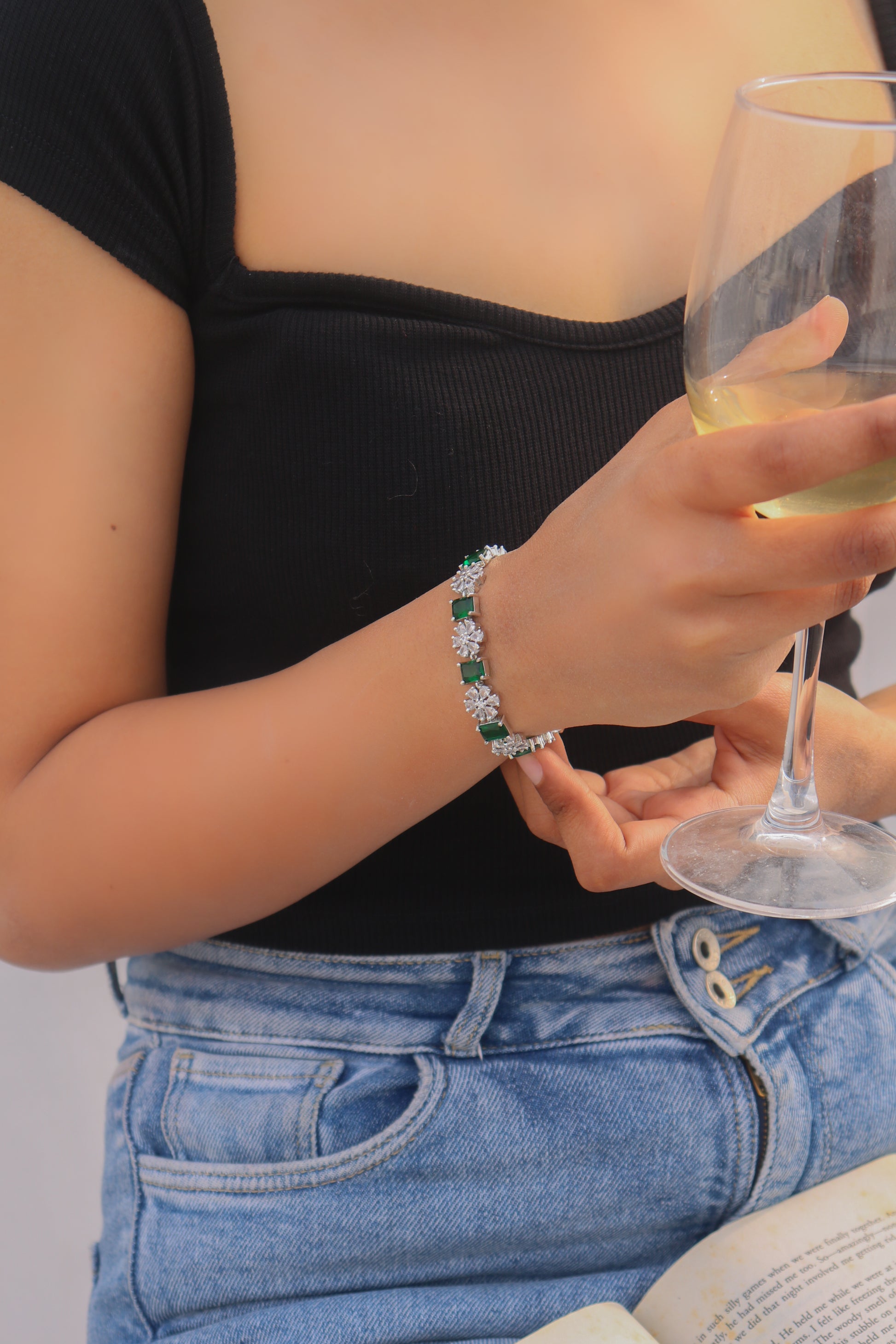 This Tyra bracelet features jade stones and faux diamonds which makes it versatile, and suitable for various occasions, from weddings and festivals to everyday wear, because of its intricacy.