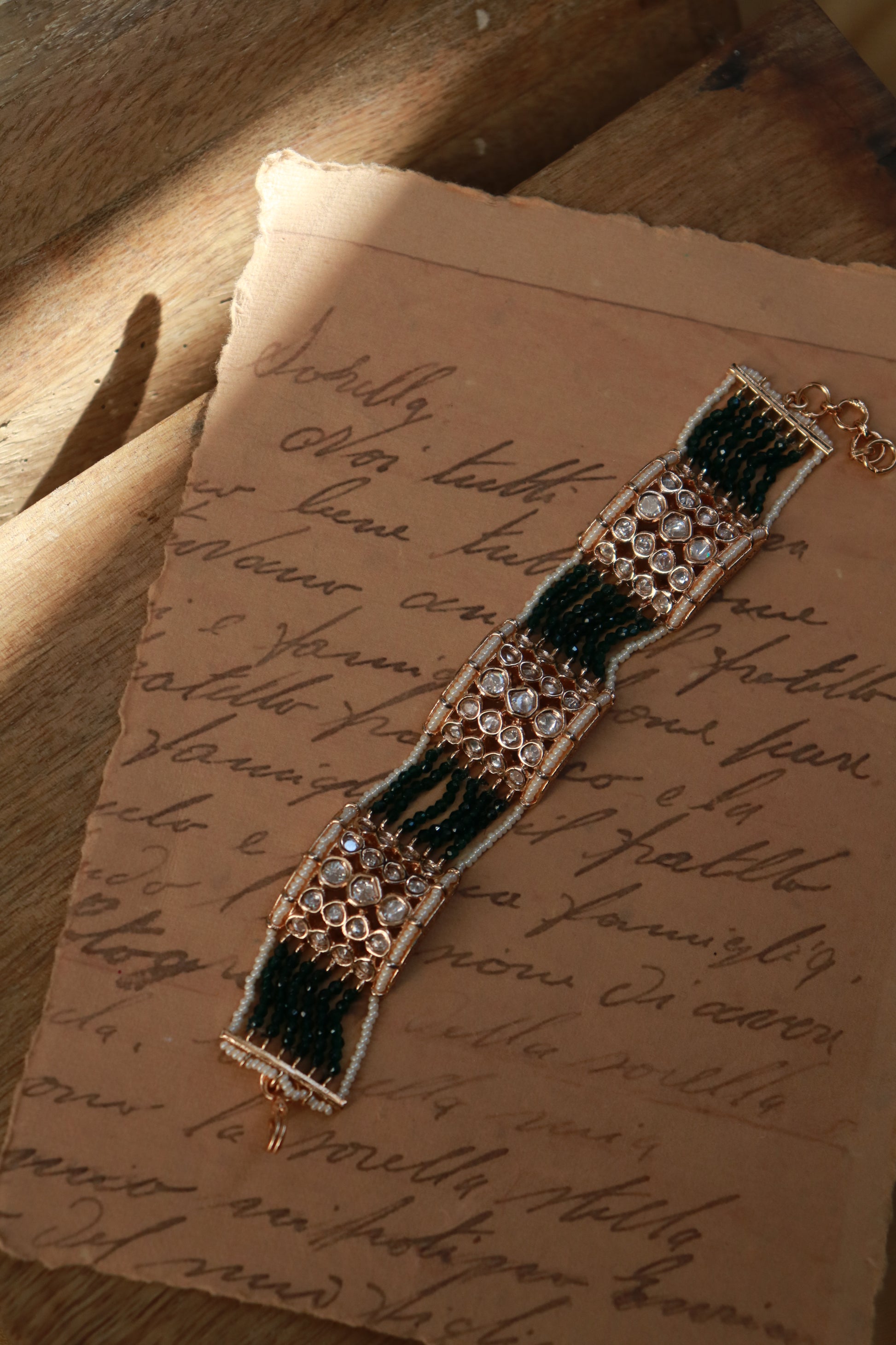 Stunning red and blue polki bracelet featuring intricate polki motifs, beautifully accented with blue semi-precious stones. A perfect blend of tradition and elegance, ideal for adding a regal touch.