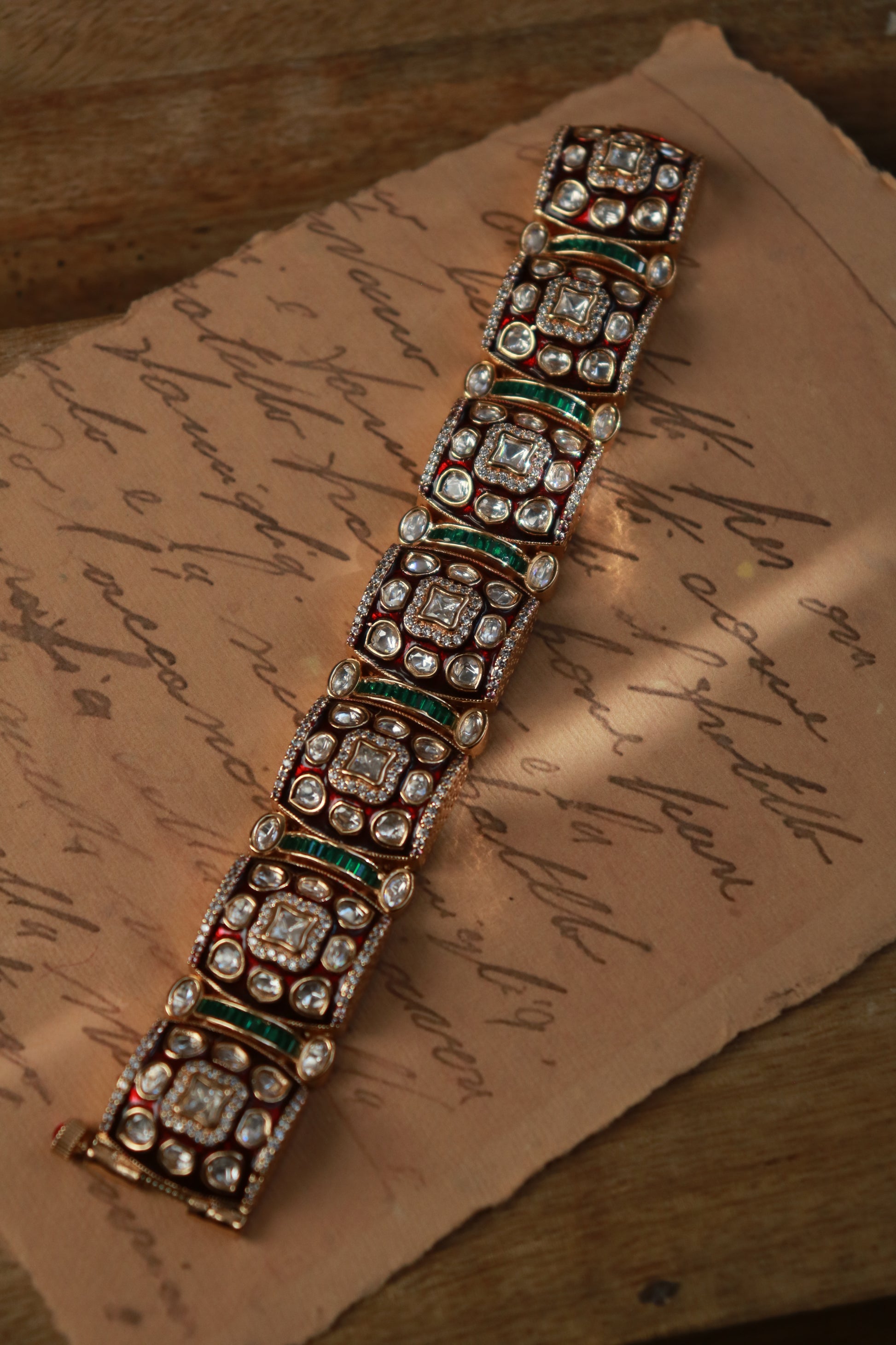 Elegant red and green polki bracelet featuring intricate gold detailing. Adorned with shimmering uncut stones, it combines traditional charm with timeless sophistication, perfect for festive occasions or enhancing everyday elegance.