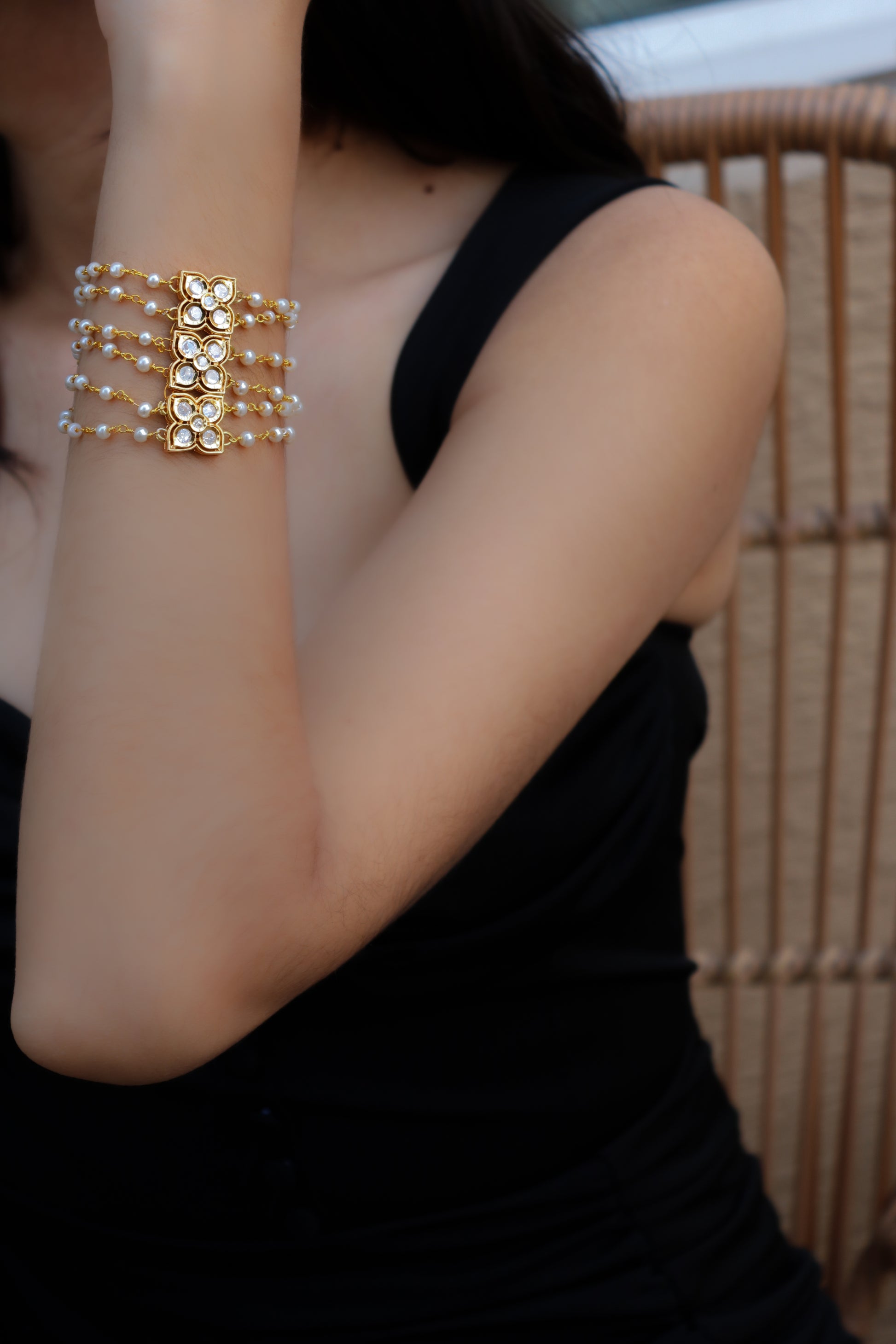 This kundan bracelet is a lovely jewel to own, the bracelet is encrusted with kundan. The design offers a versatile design that can be paired with almost everything.