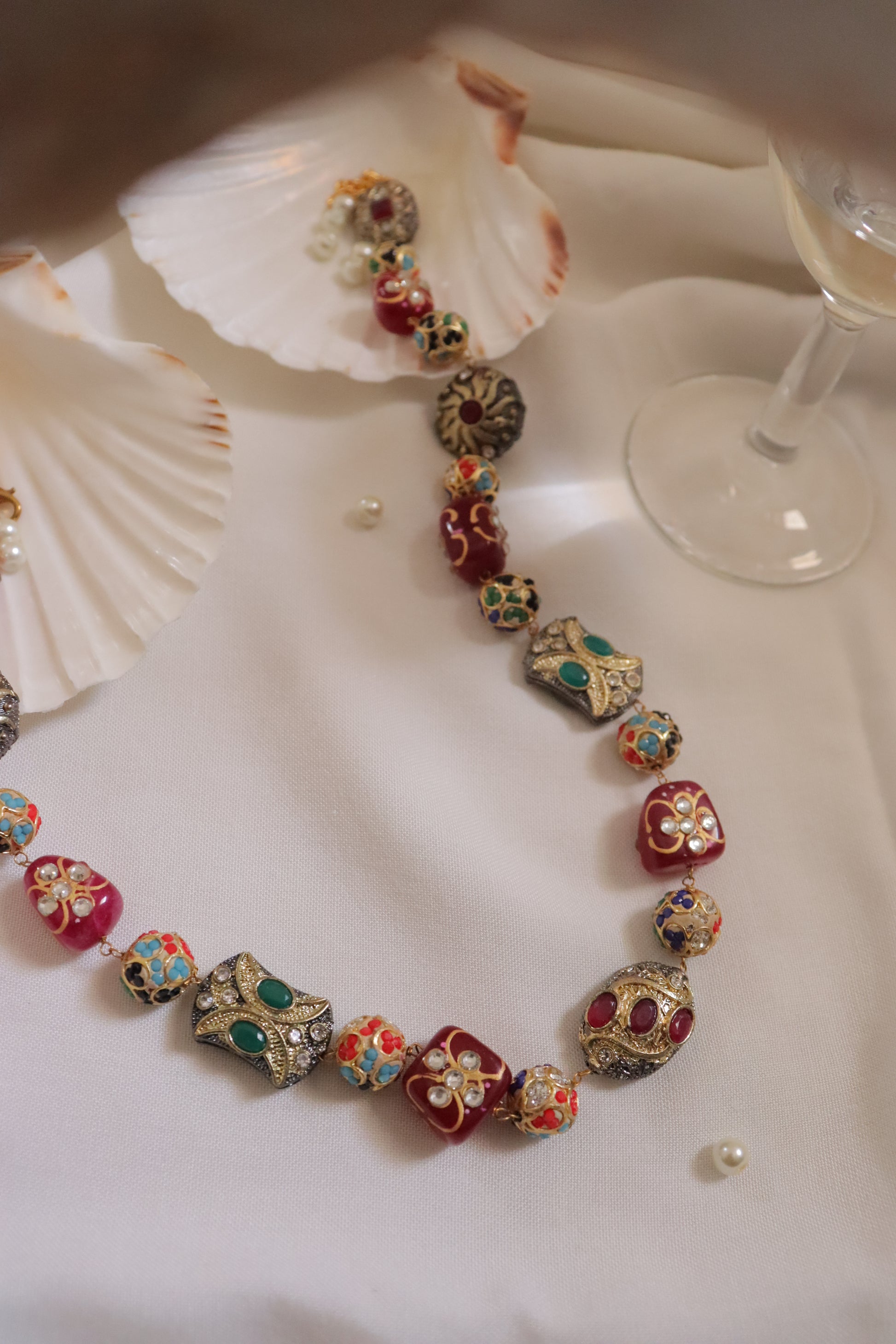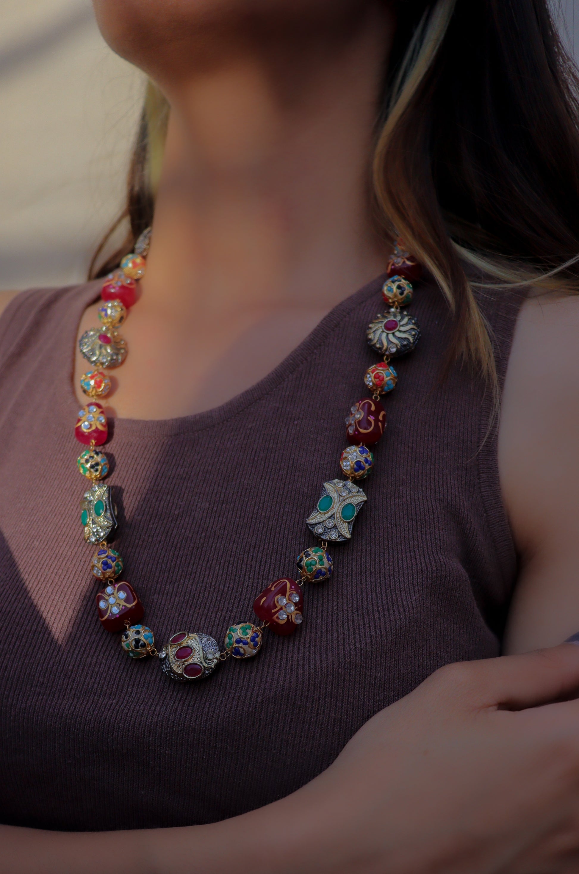 The necklace design uses a combination of lively hued stones and exclusively handcrafted units to create a one of a kind piece. Make a bold statement with this quirky design.