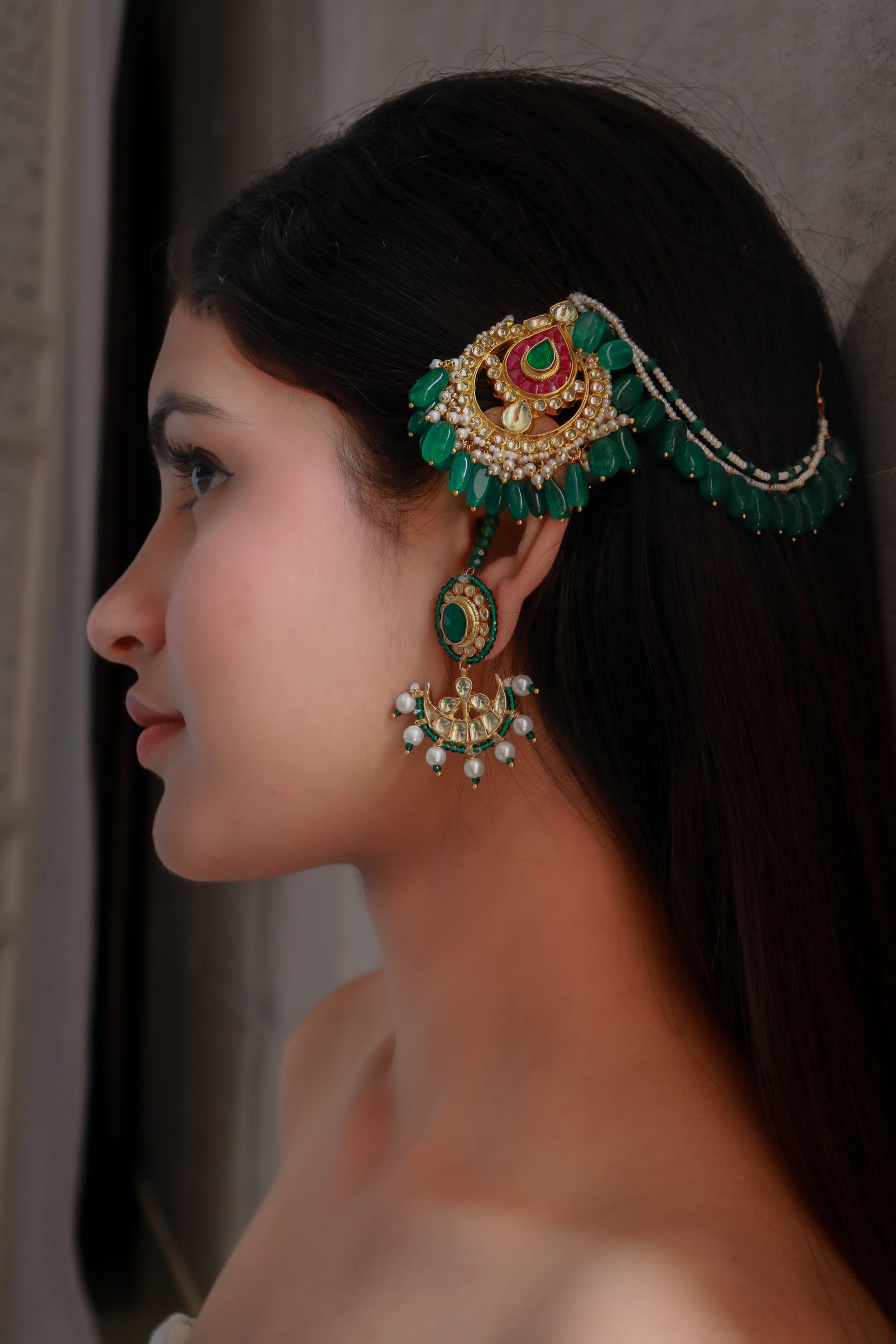 These enchanting kundan earrings feature an elegant ear chain, reminiscent of a passa, gracefully adorning your hair. A stunning fusion of tradition and modernity, adding a touch of glamour to any ensemble.