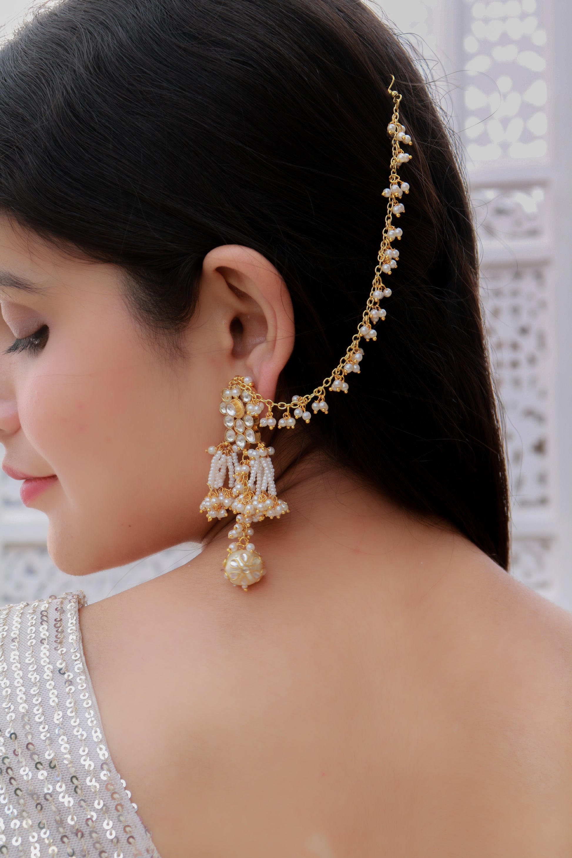 These exquisite Kundan earrings, adorned with lustrous pearls, capture regal elegance. A delicate pearl chain cascades gracefully through the hair, creating a timeless, sophisticated look that beautifully complements traditional and modern attire alike.