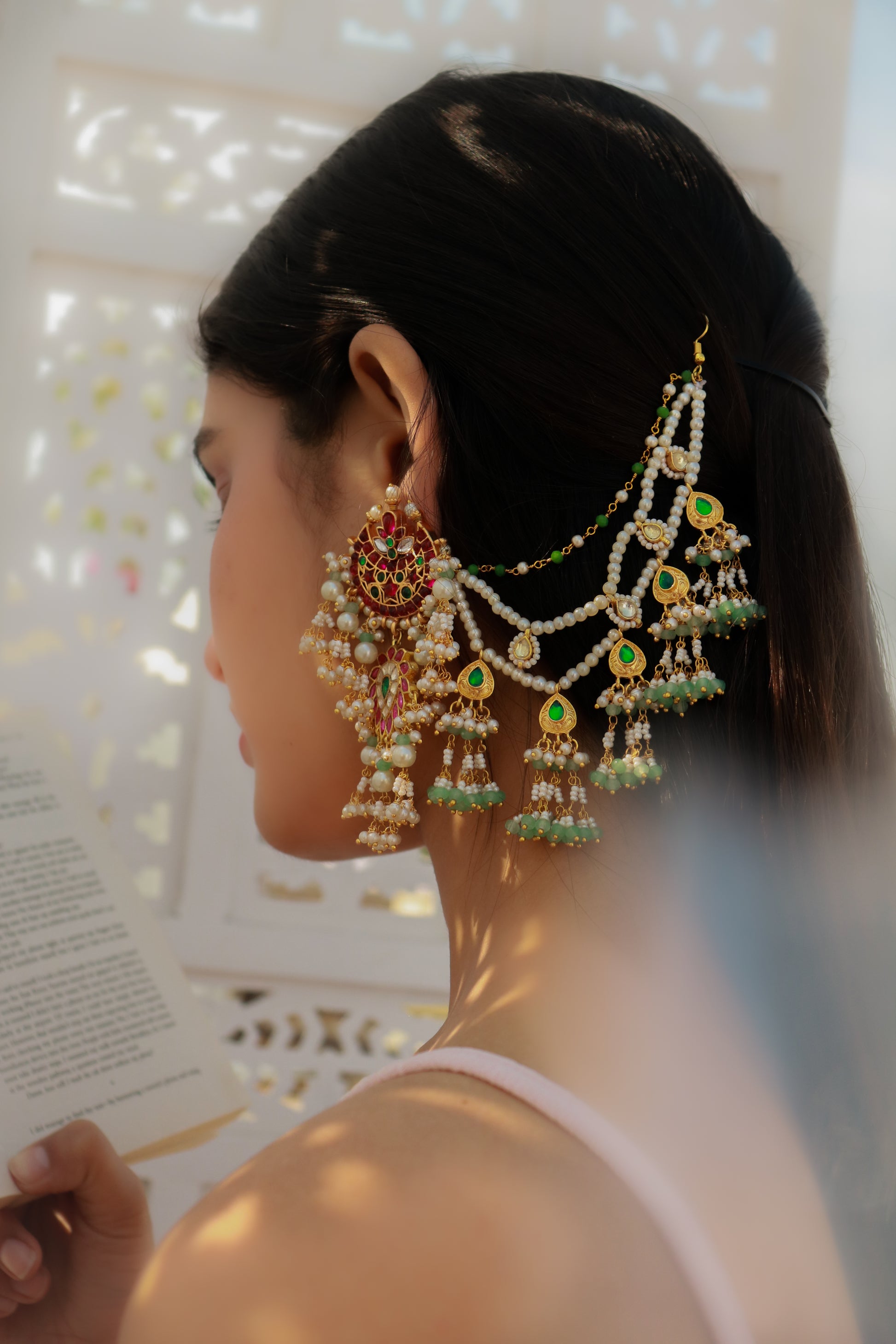 These stunning Kundan earrings, adorned with intricate ear chains, exude regal elegance. The timeless design boasts brilliant craftsmanship, with shimmering gemstones capturing light beautifully. The cascading ear chains add a graceful touch, making them perfect for a statement-worthy look.