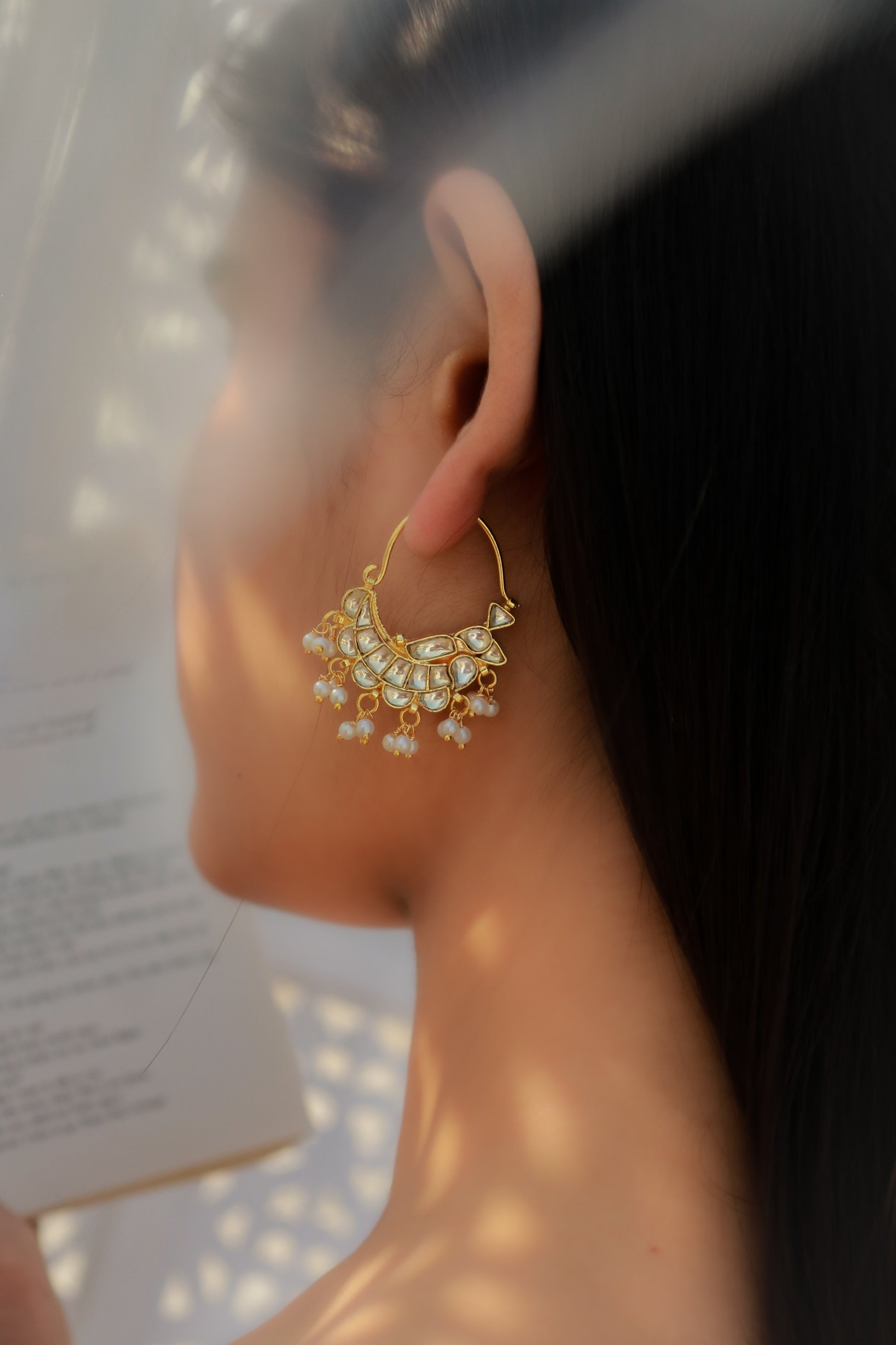 Graceful Kundan hoop earrings, embellished with delicate pearl trinkets, blend traditional charm with contemporary elegance. Their radiant design and intricate details make them the perfect accessory for any festive or bridal occasion.