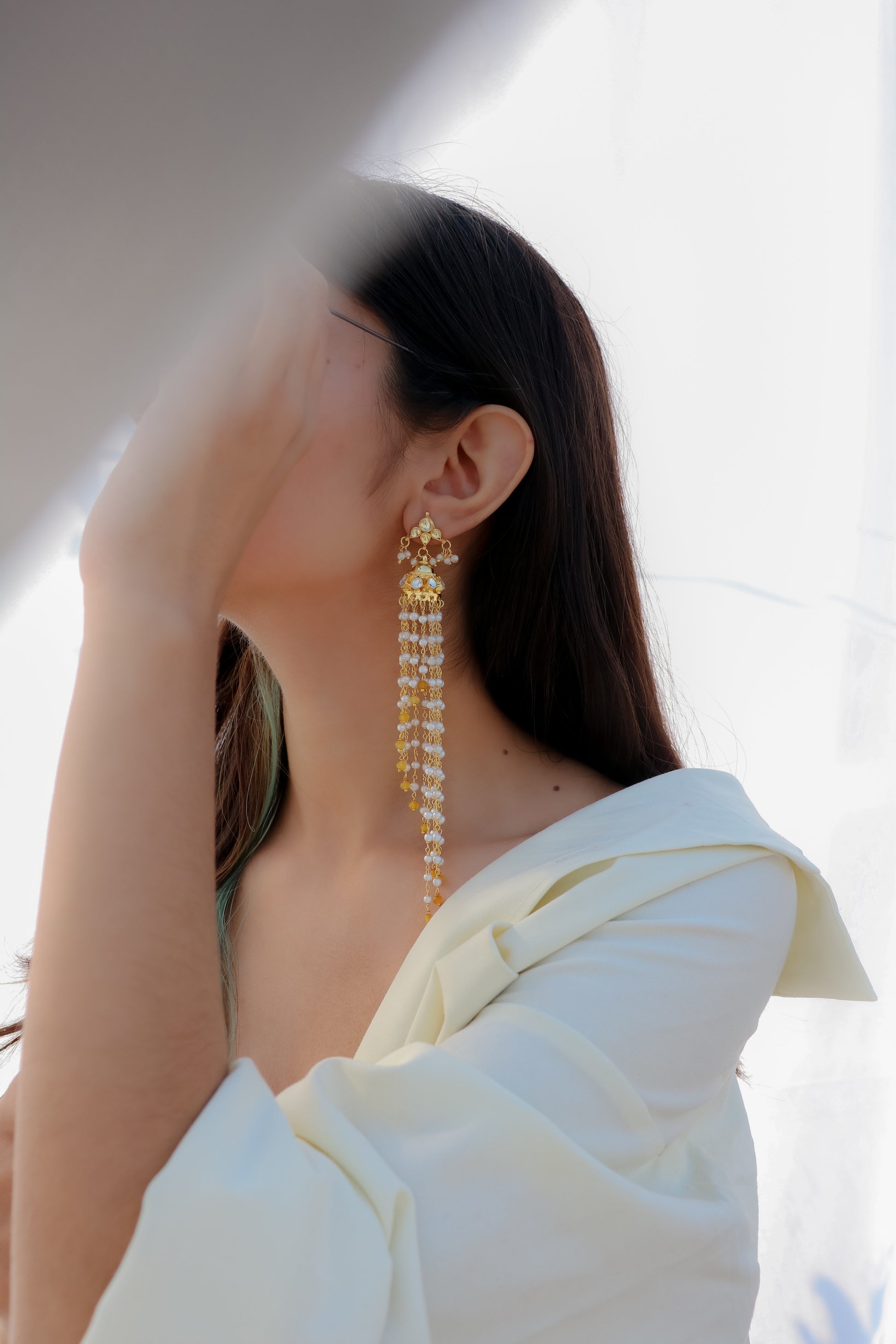 The sophisticated kundan studded design features dangling strings of pearls with a yellow stone dangling from it.