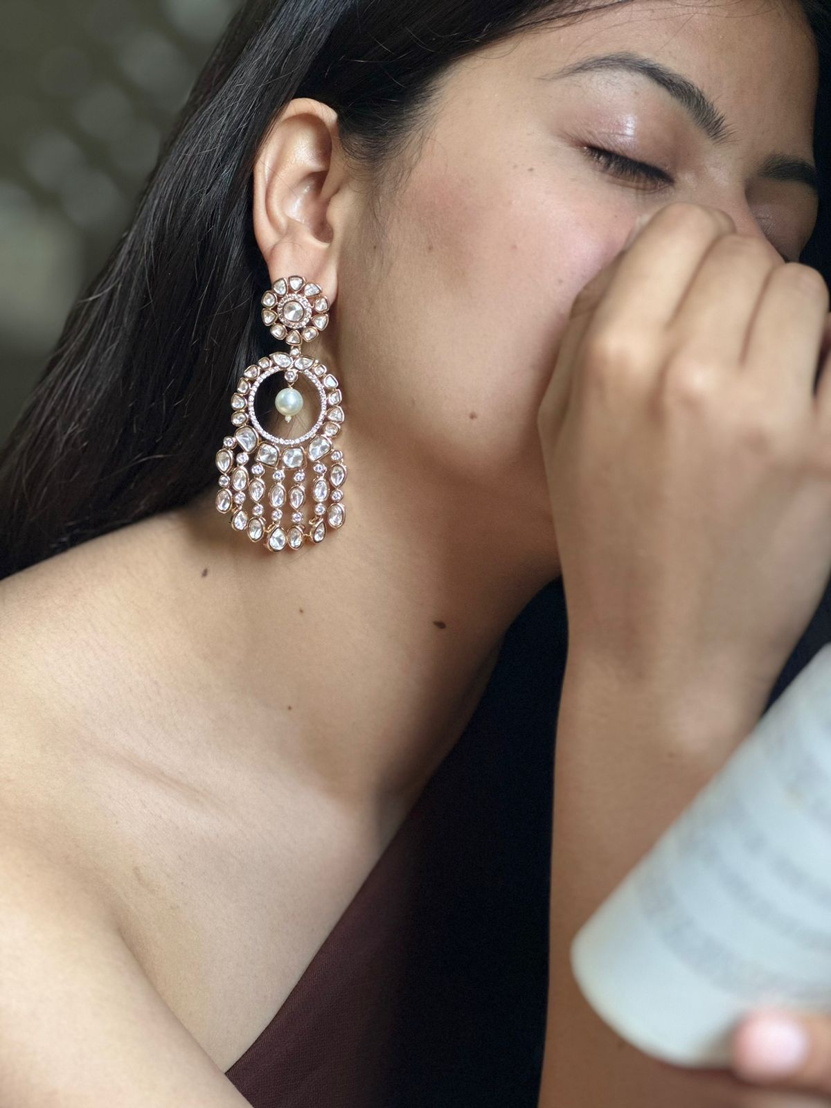 Ersheen Polki earrings adorned with intricate designs, accentuated by a delicate rose gold touch. Radiating elegance and charm, they effortlessly blend tradition with contemporary allure, perfect for any occasion.