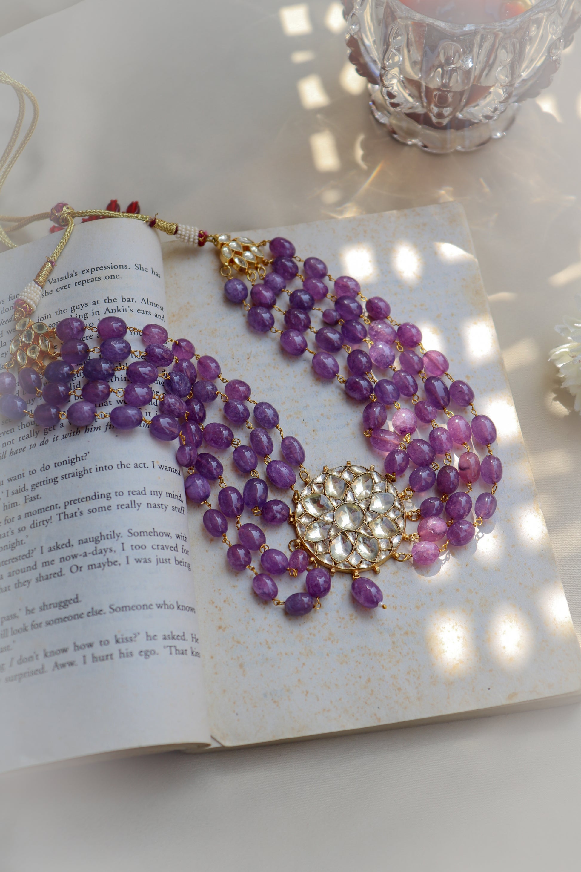 The Fameez kundan necklace features a kundan center unit hanging through strings of purple stones.