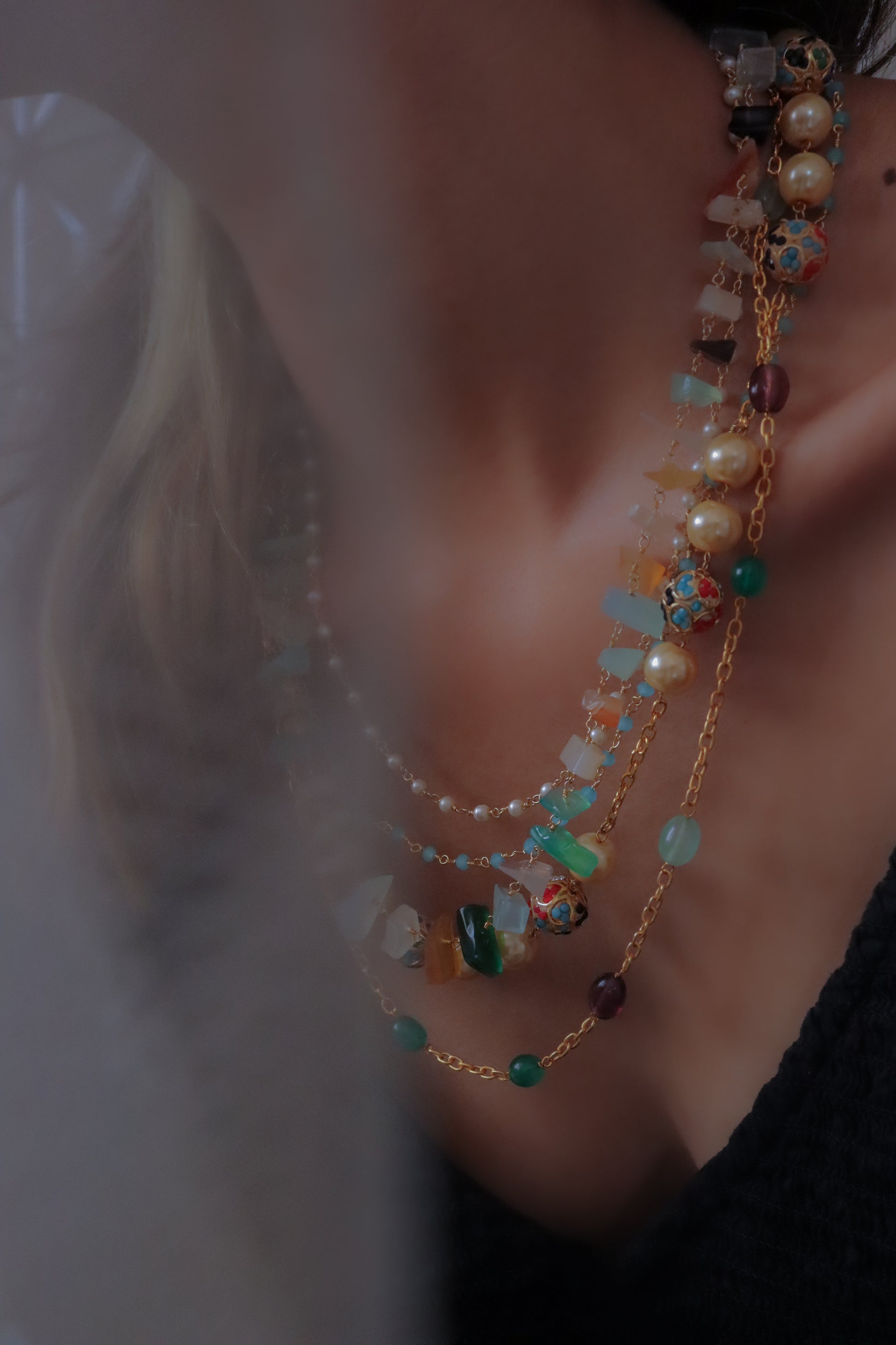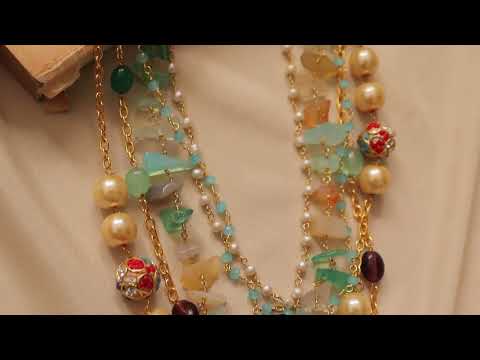 Frivolous and playful, the design is a frenzied medley of different elements and hues. This pretty necklace boasts different layers, each with a pretty set of elements.