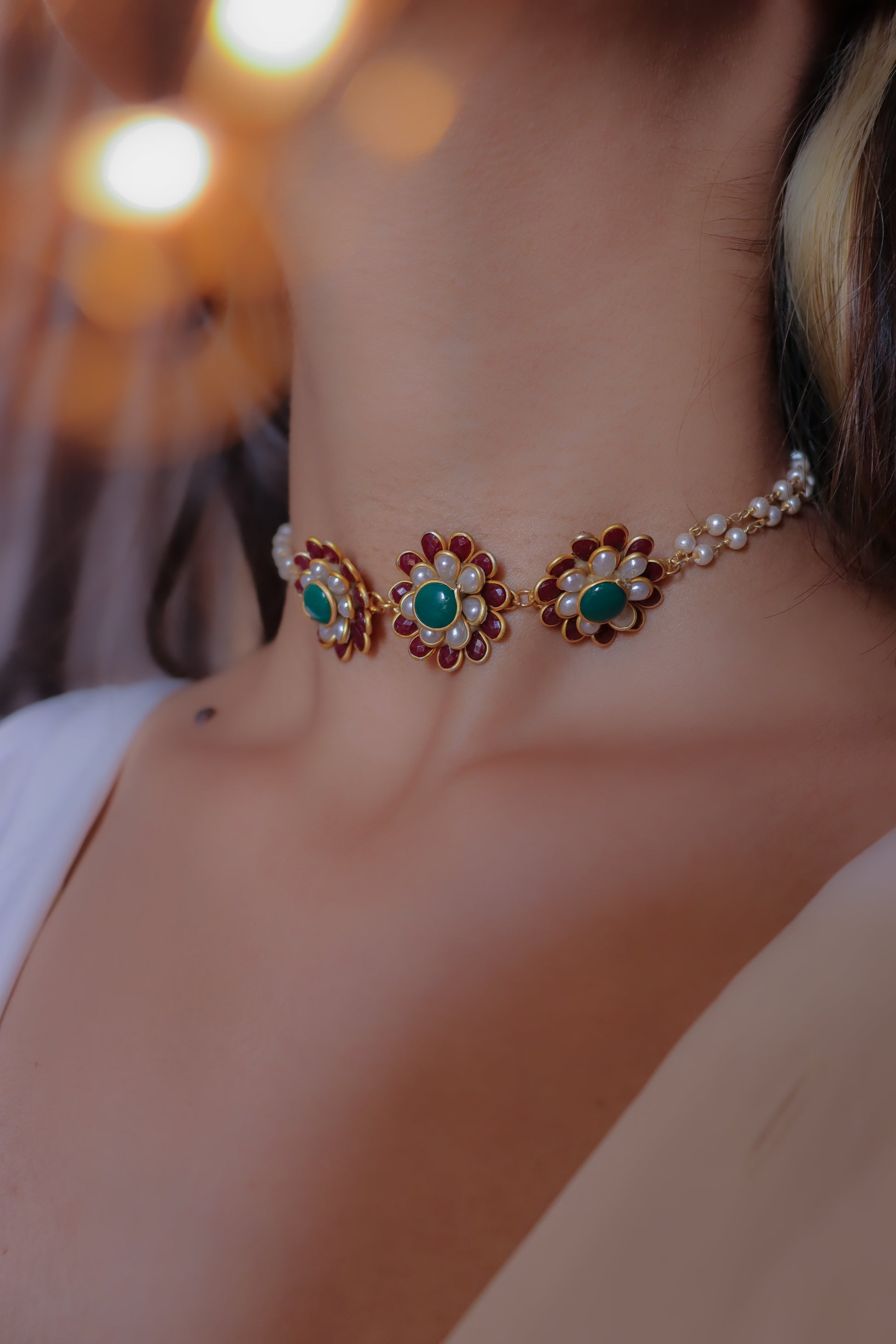 This floral design features beautiful hues of green and red, harmoniously blending with the sophisticated white of mother of pearl. The choker can be a great accessory for everyday wear.