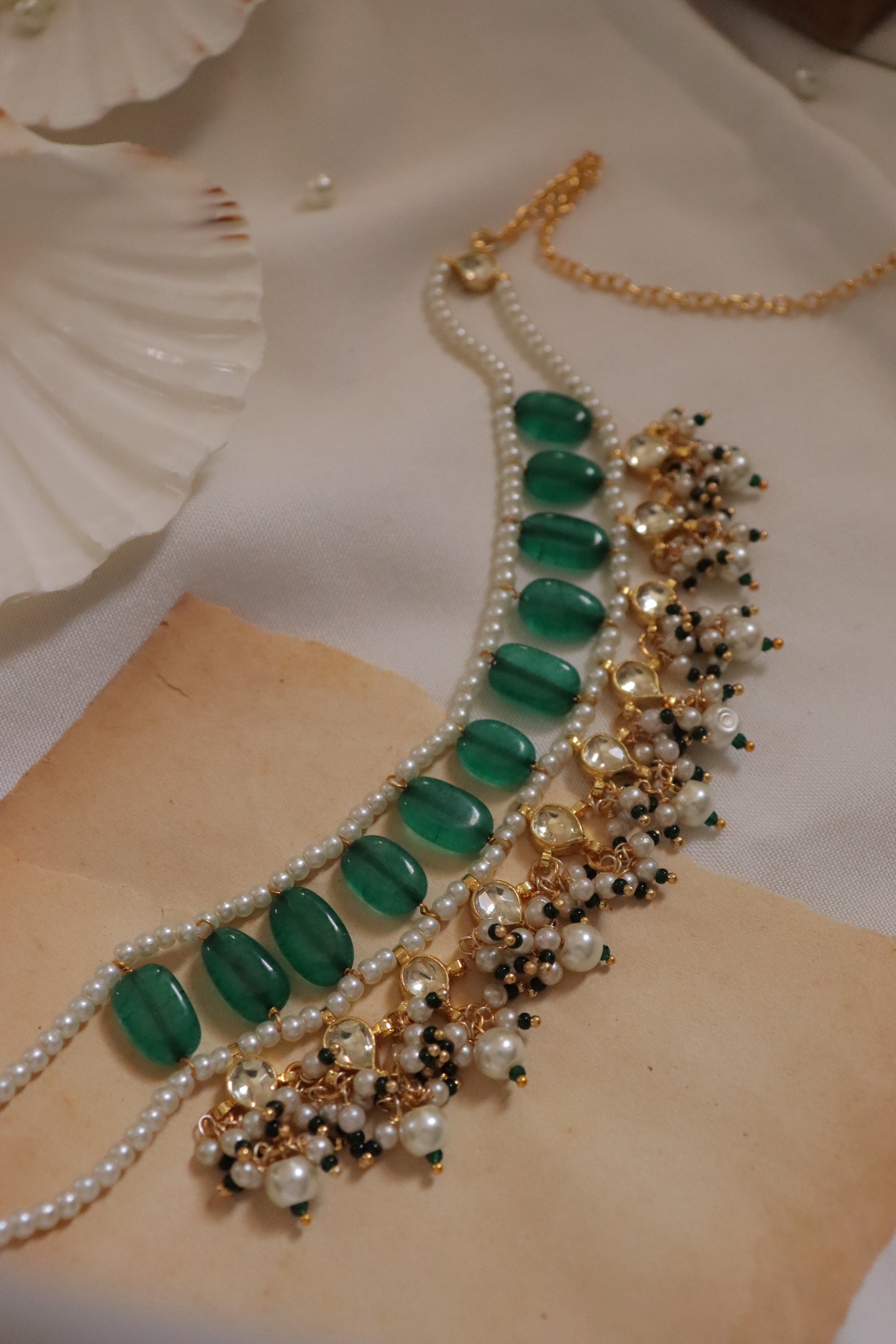 Beautiful stones take the center stage in this pretty necklace. The necklace features green stones strung together in a perfect line with pearls lining the top and bottom of the design. The bottom of the design boasts kundan embellished with pearl trinkets.