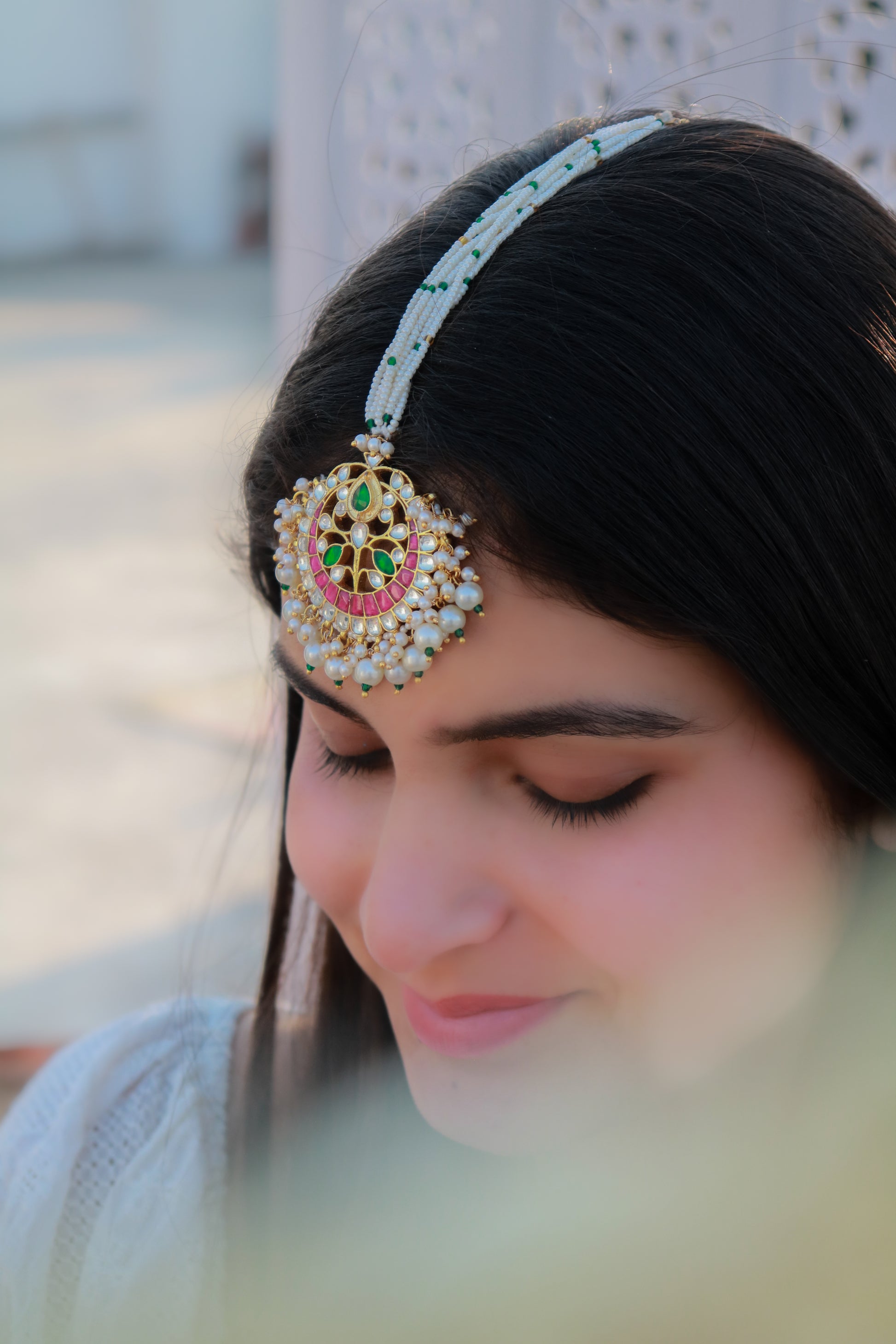 A breathtaking pink and green kundan maangtikka, adorned with shimmering round pearls and delicate green trinkets. Clusters of tiny white and green pearl strings cascade gracefully, creating a harmonious blend of elegance, tradition, and timeless allure.