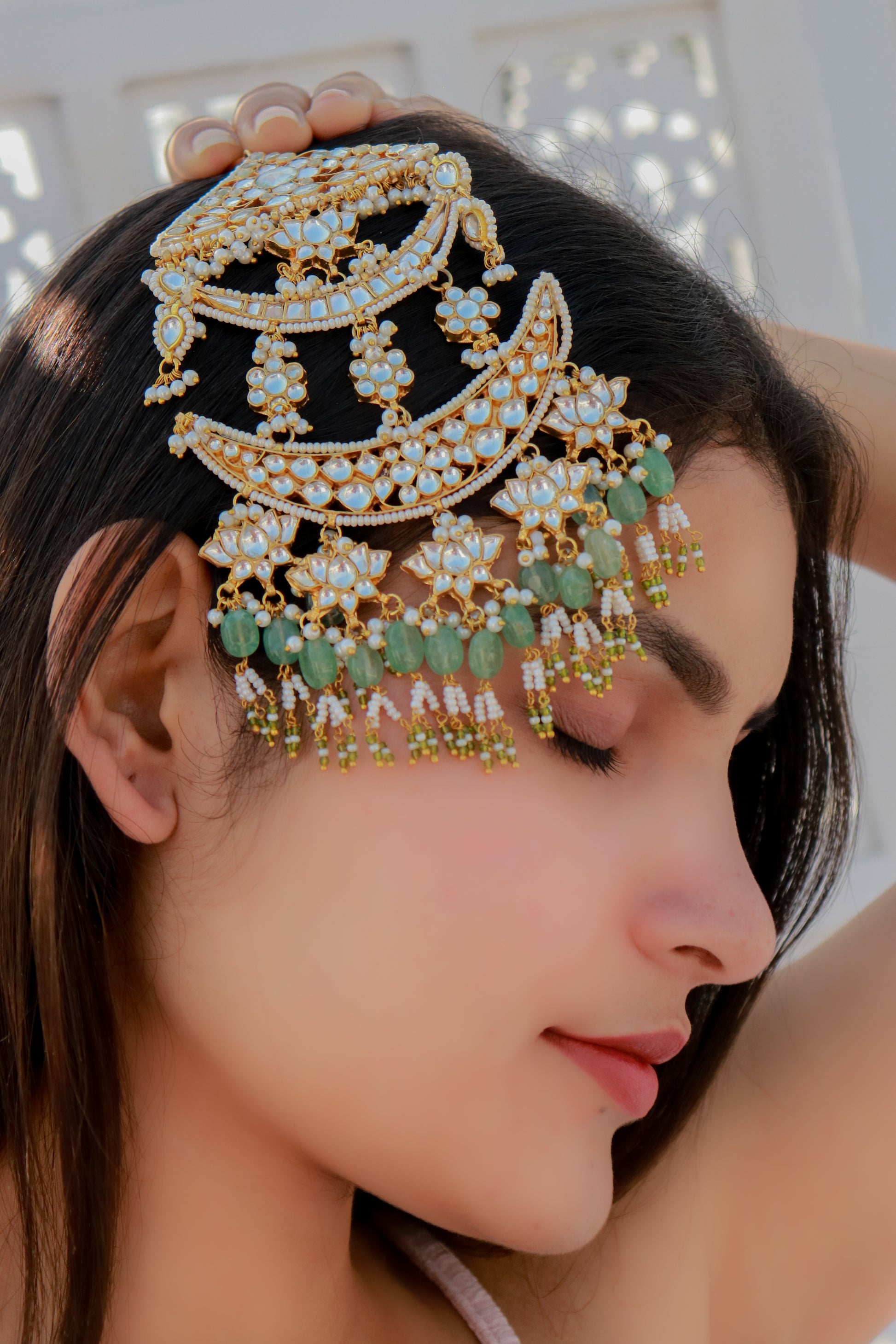 Elevate your nikkah look with this exquisite Kundan passa, adorned with delicate mint-colored trinkets. Its intricate craftsmanship and regal charm make it a timeless accessory, adding elegance and grace to your bridal ensemble. A true heirloom treasure!