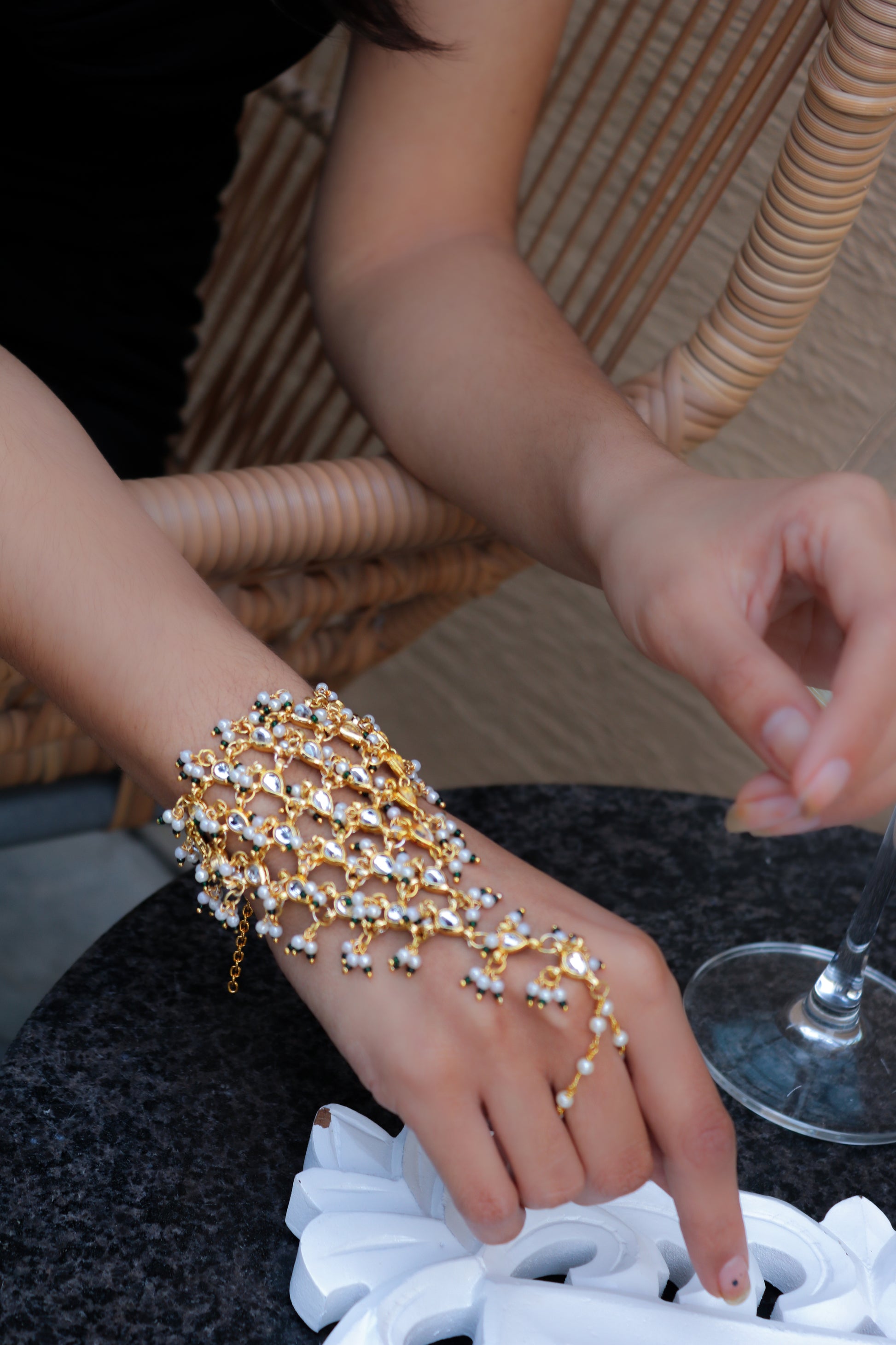 Replete with traditional grandeur and charm, this pretty hathphool boasts luxury in its design. The ritualistic hues make it a perfect traditional accessory to complete your traditional look.