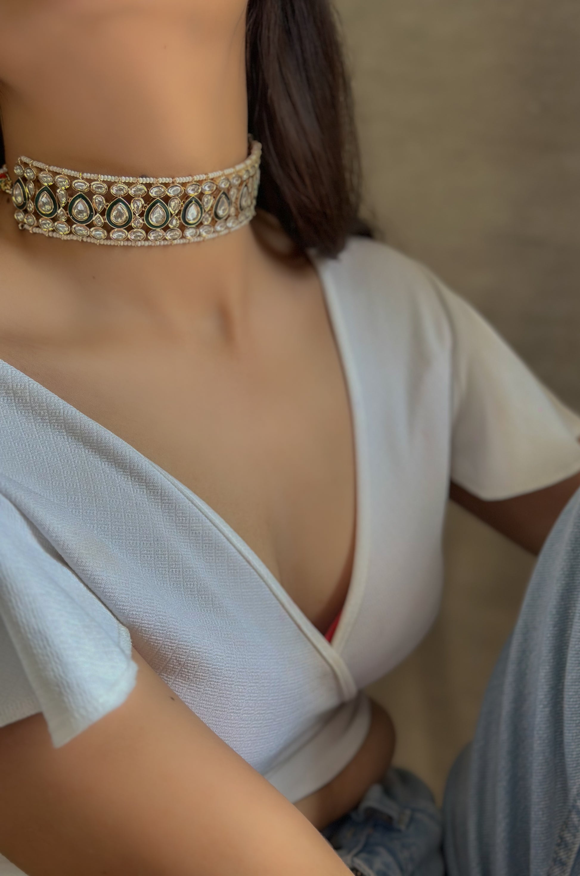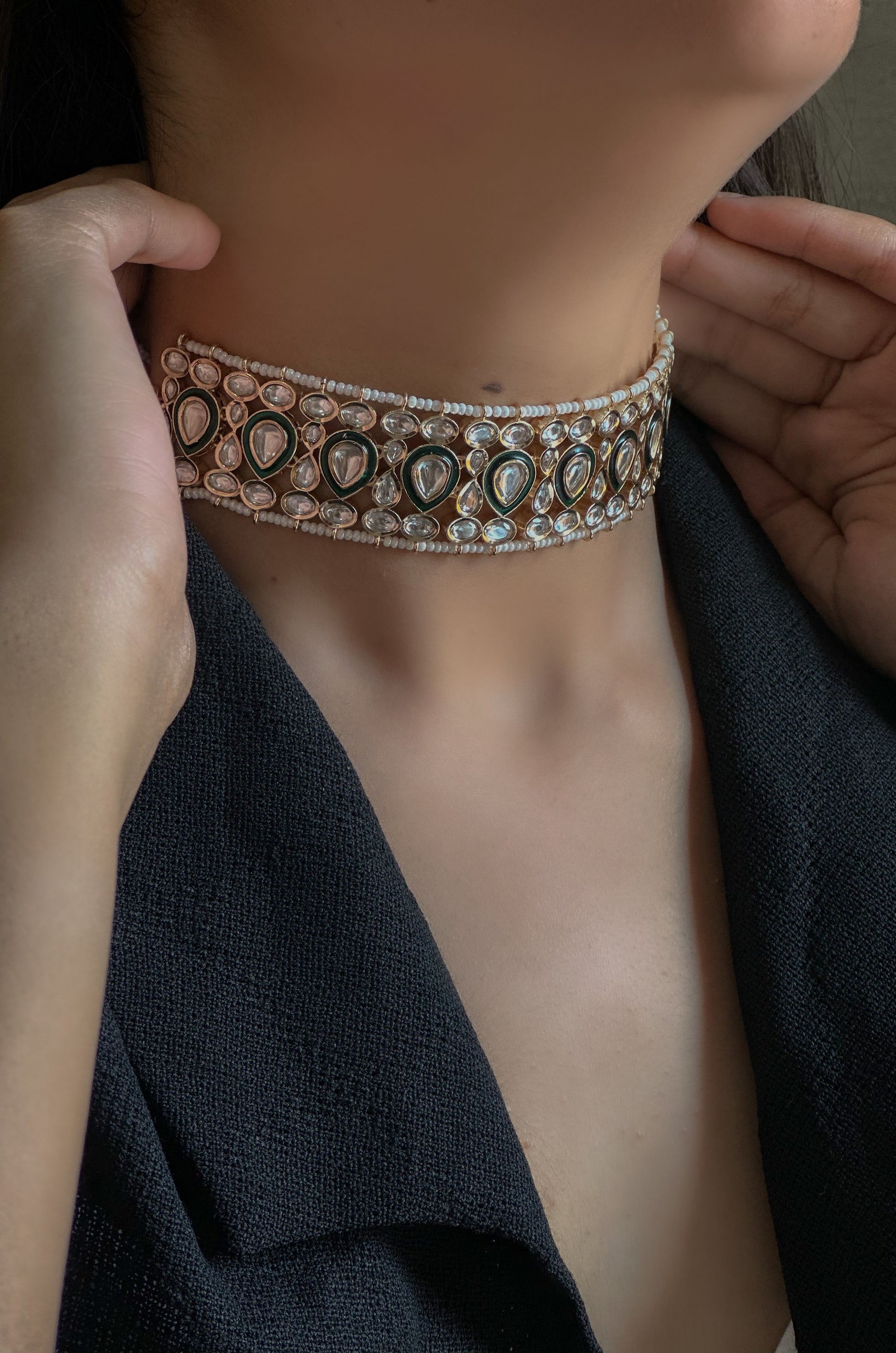 This beautifully crafted Polki necklace features a stunning design with a delicate outline of green, adding a touch of vibrancy and elegance. Perfect for adding a pop of color to any ensemble.