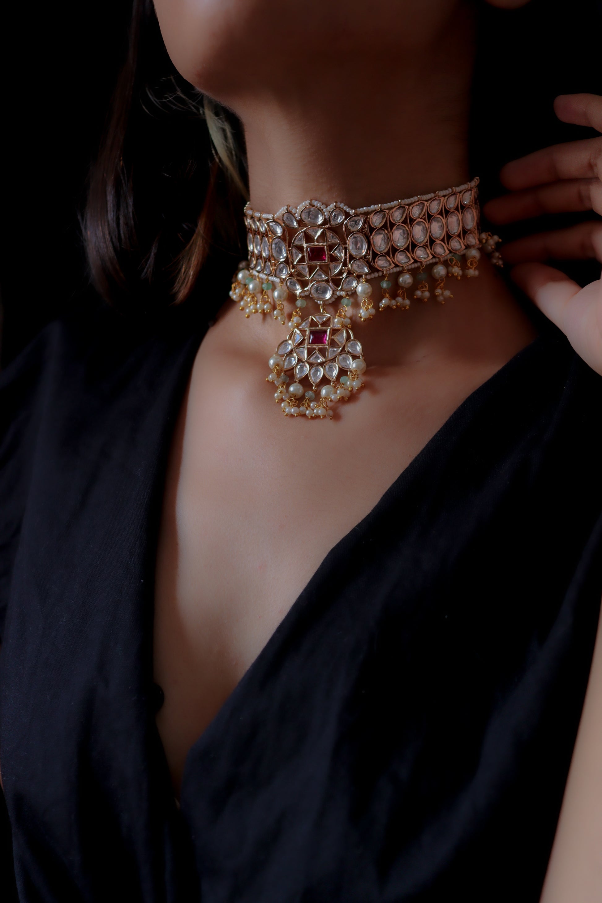 This kundan choker is rooted in traditional heritage, the design features a kundan encrusted design with red hue at the center. The design is embellished with accents of mint stones and pearls.