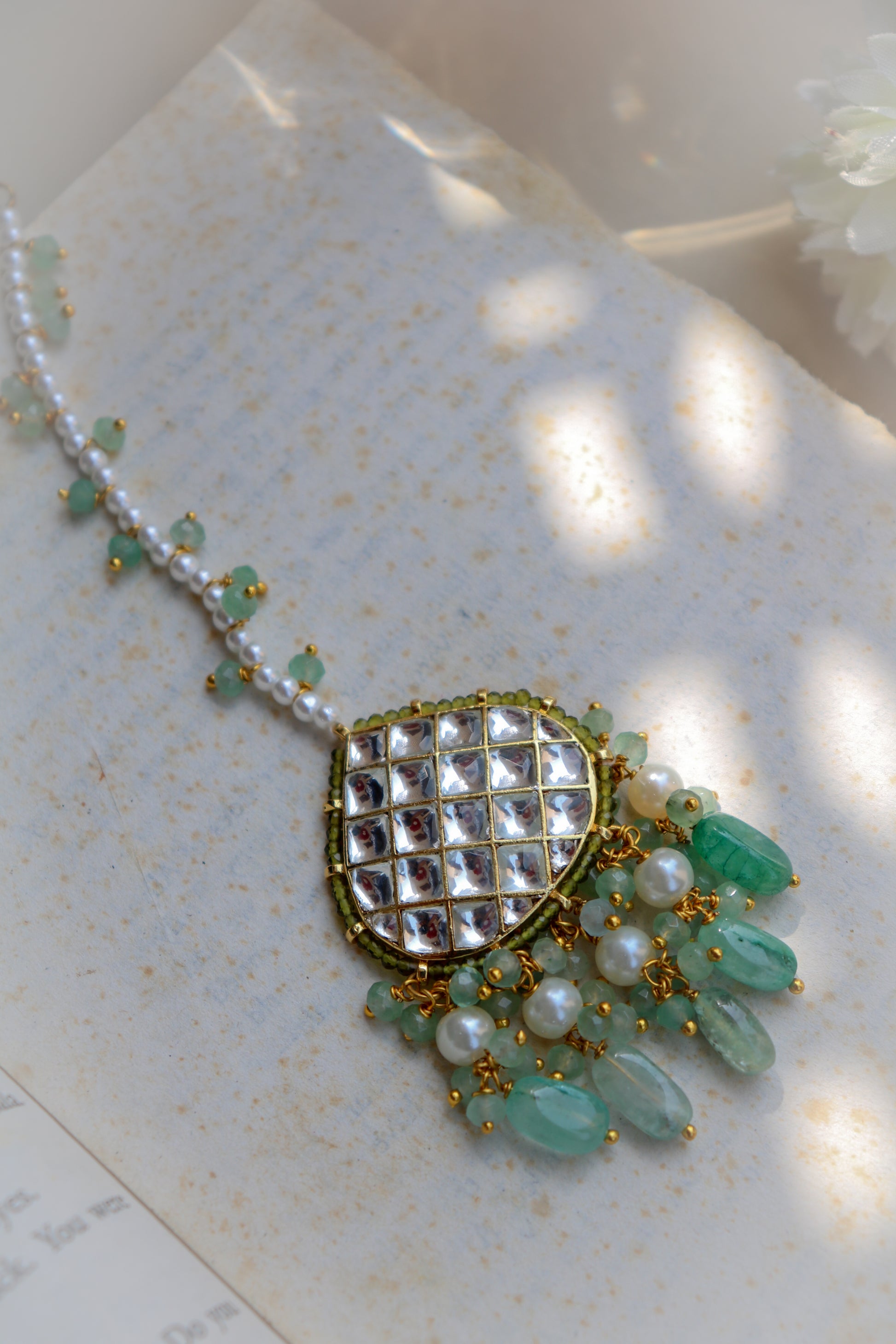 The Inayat maangtikka is a dreamy design full of lively hues. The design features a kundan tikdi finished off with pearls and mint stones.