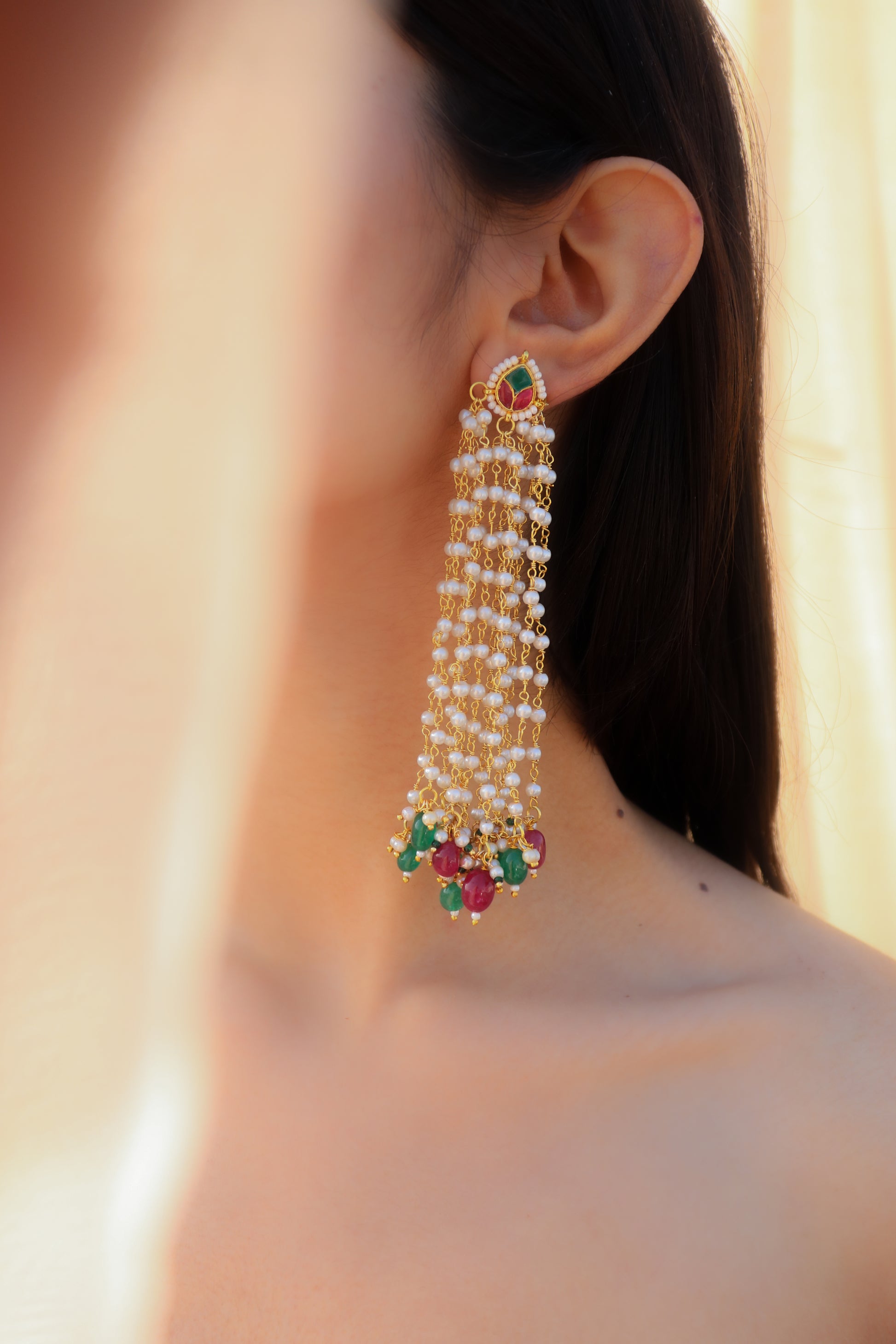 Earrings can't get more timeless than this! Classic pearls meet a very chic design. The strings of pearl form a beautiful kundan unit.
