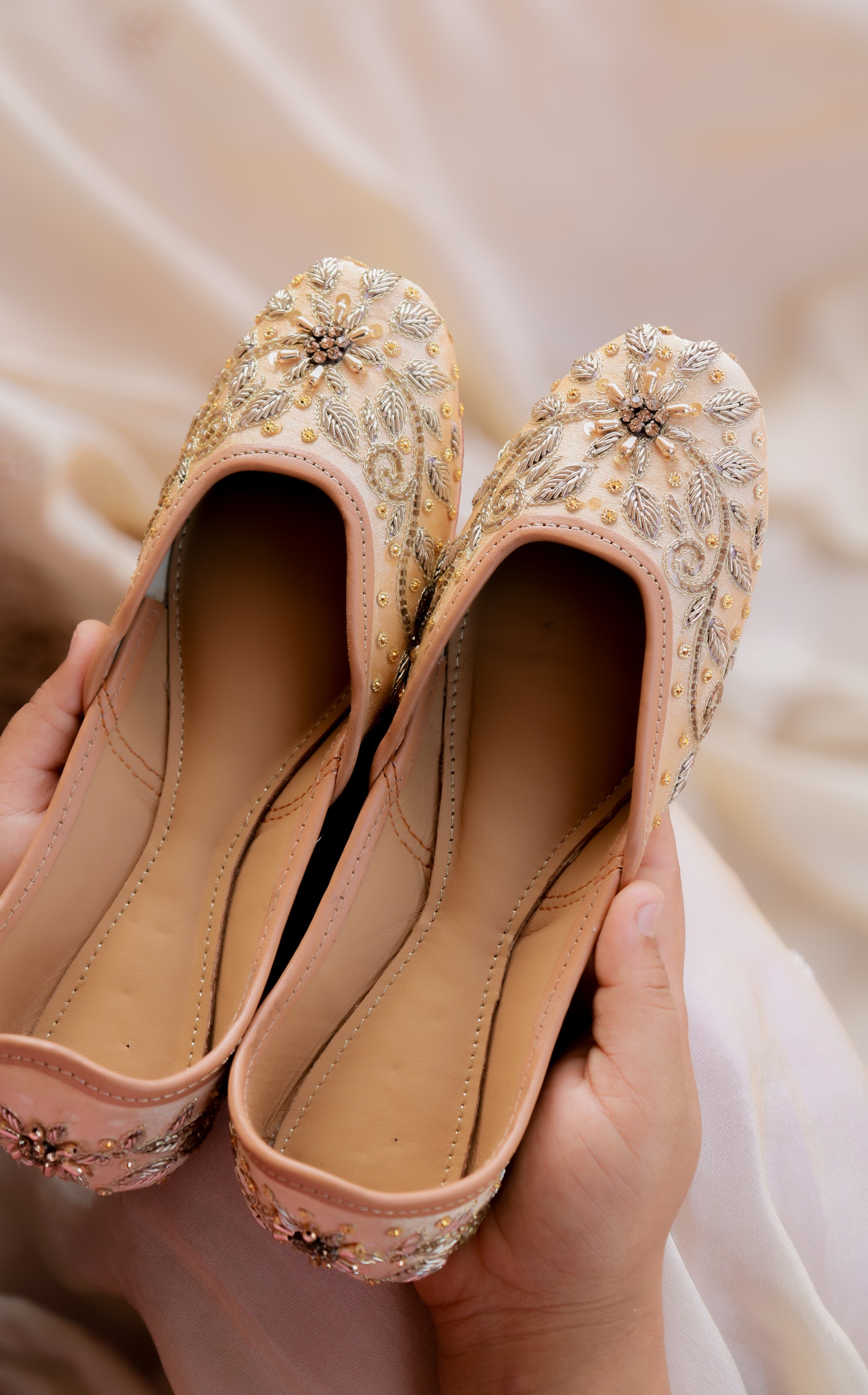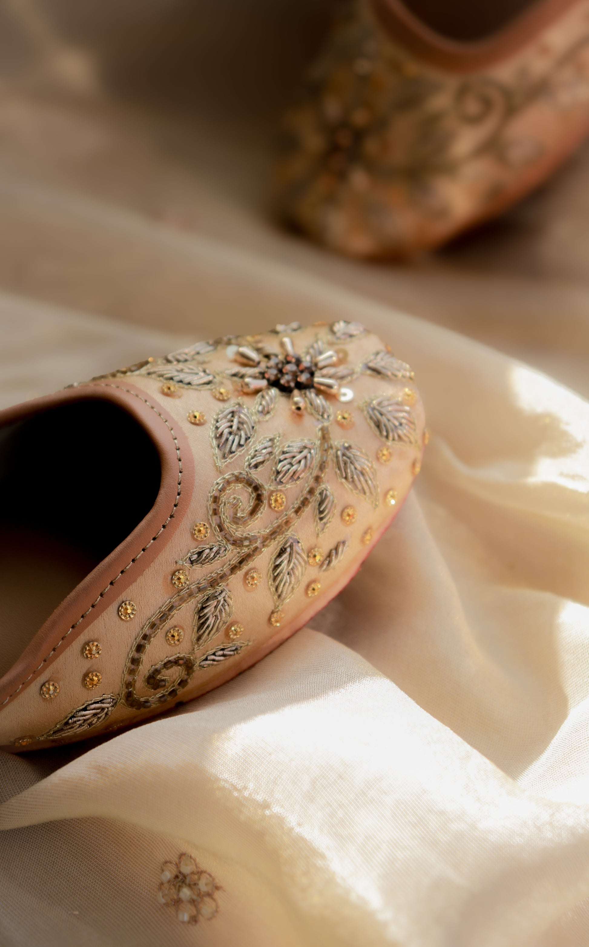 This stunning Punjabi jutti is handcrafted on a radiant golden base, beautifully hand-embroidered with intricate zardozi and shimmering cutdana stones. Adorned with elegant floral patterns, it exudes regal charm and timeless grace, making it a perfect choice for festive celebrations and traditional occasions.