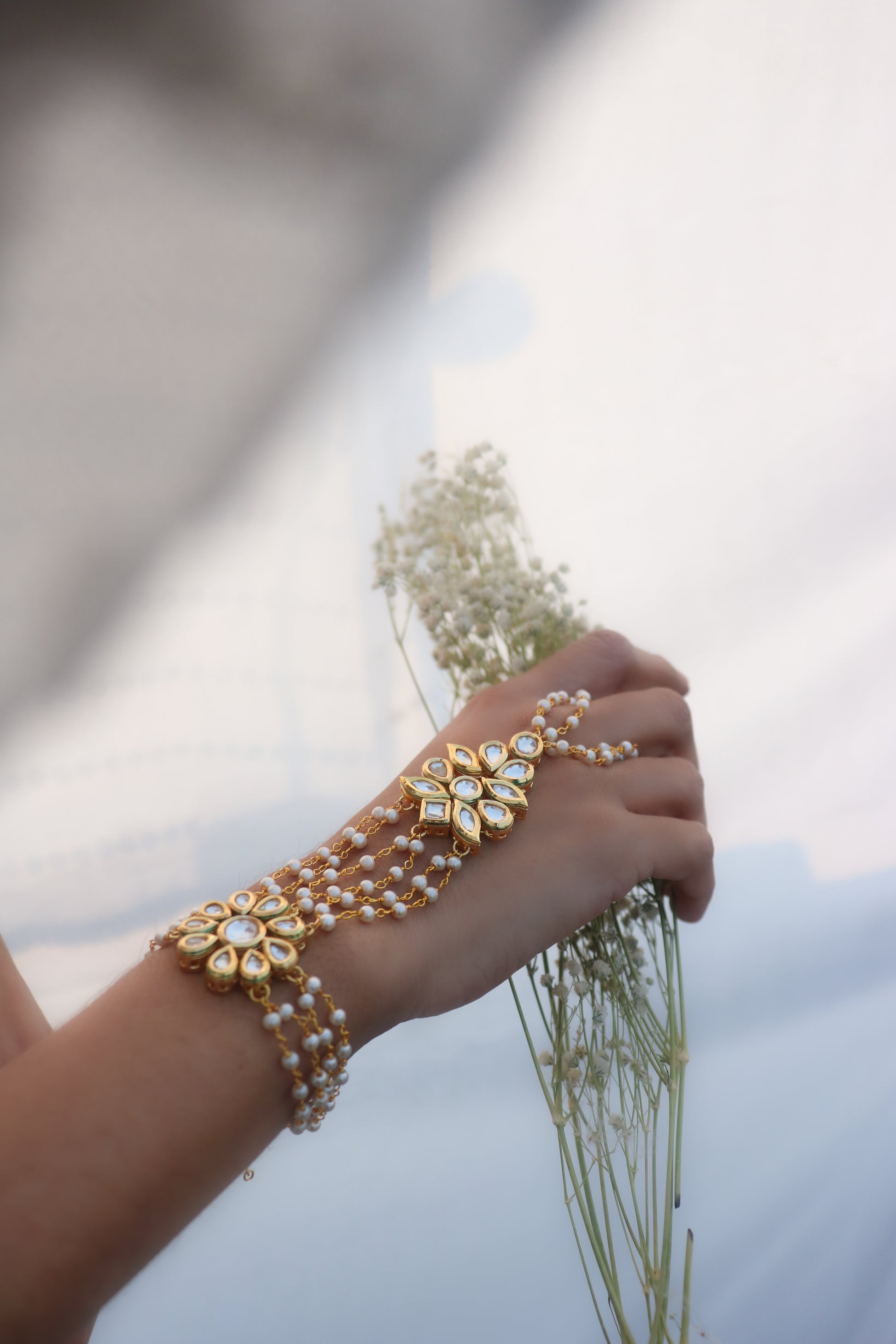 Replete with traditional grandeur and charm, this pretty hathphool boasts luxury in its design. The ritualistic hues make it a perfect traditional accessory to complete your traditional look.