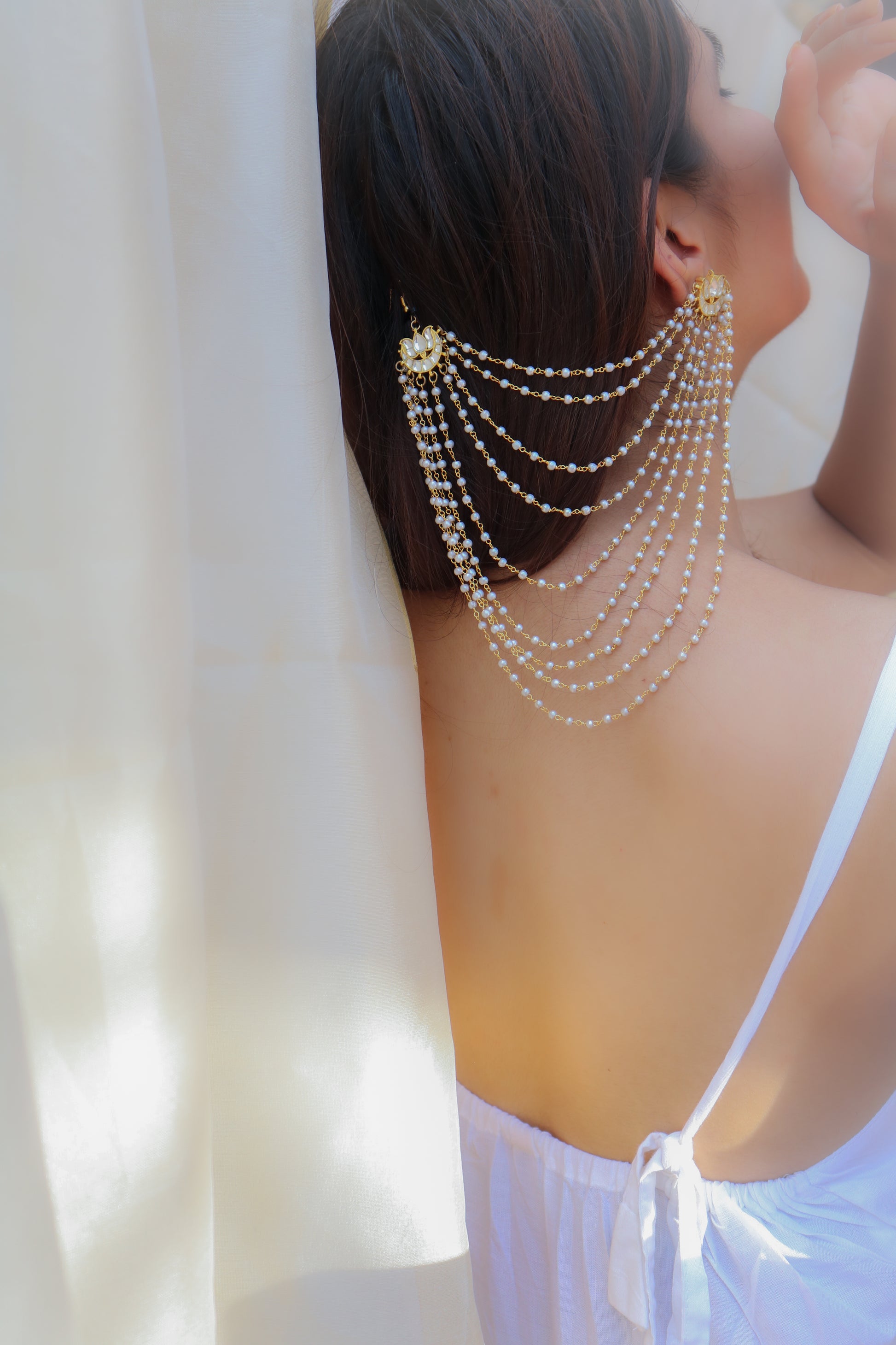 The Lotus earrings are a beautiful piece with heavenly strings of pearls falling in perfect symmetry from a lotus shaped kundan unit.