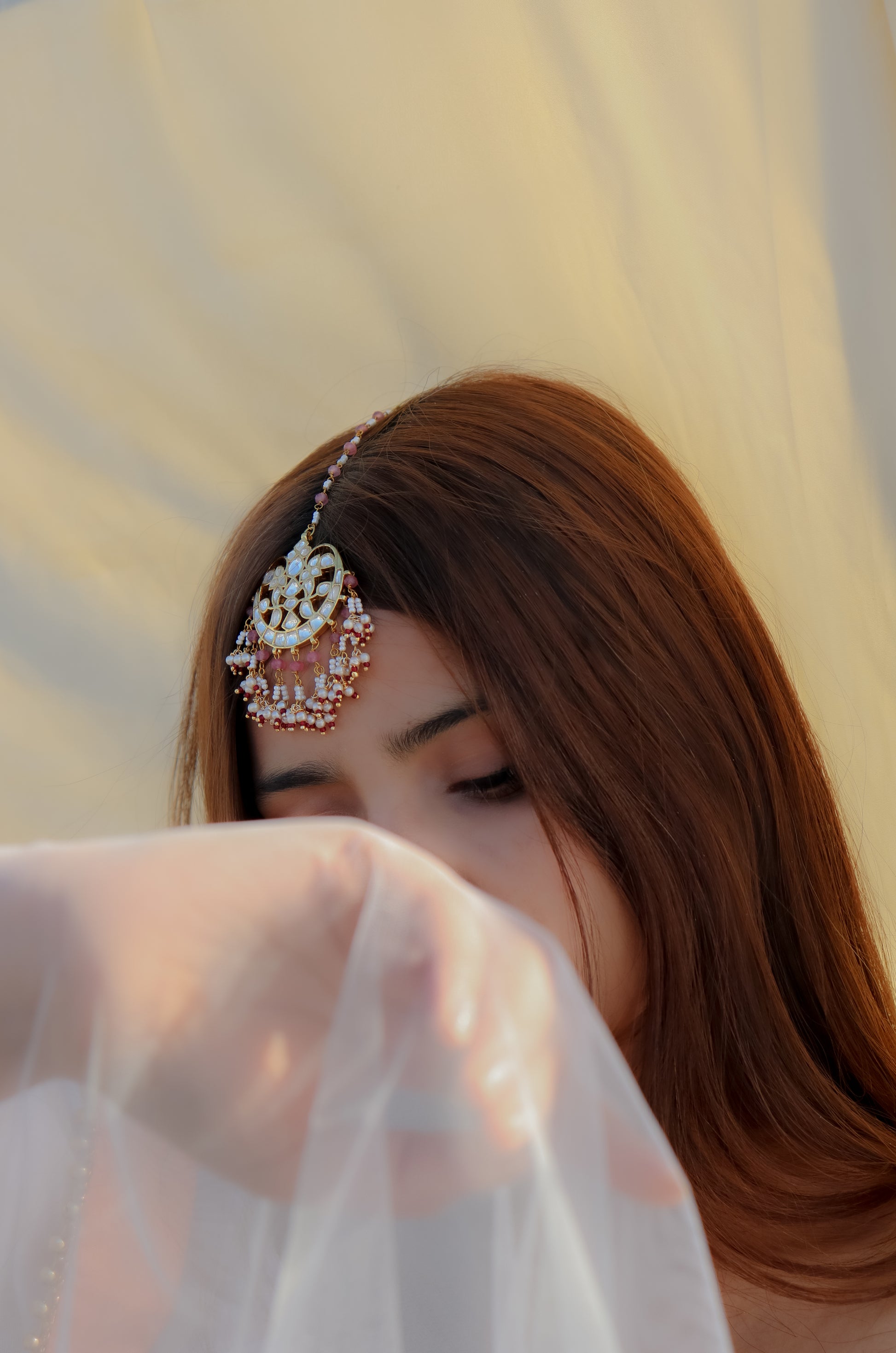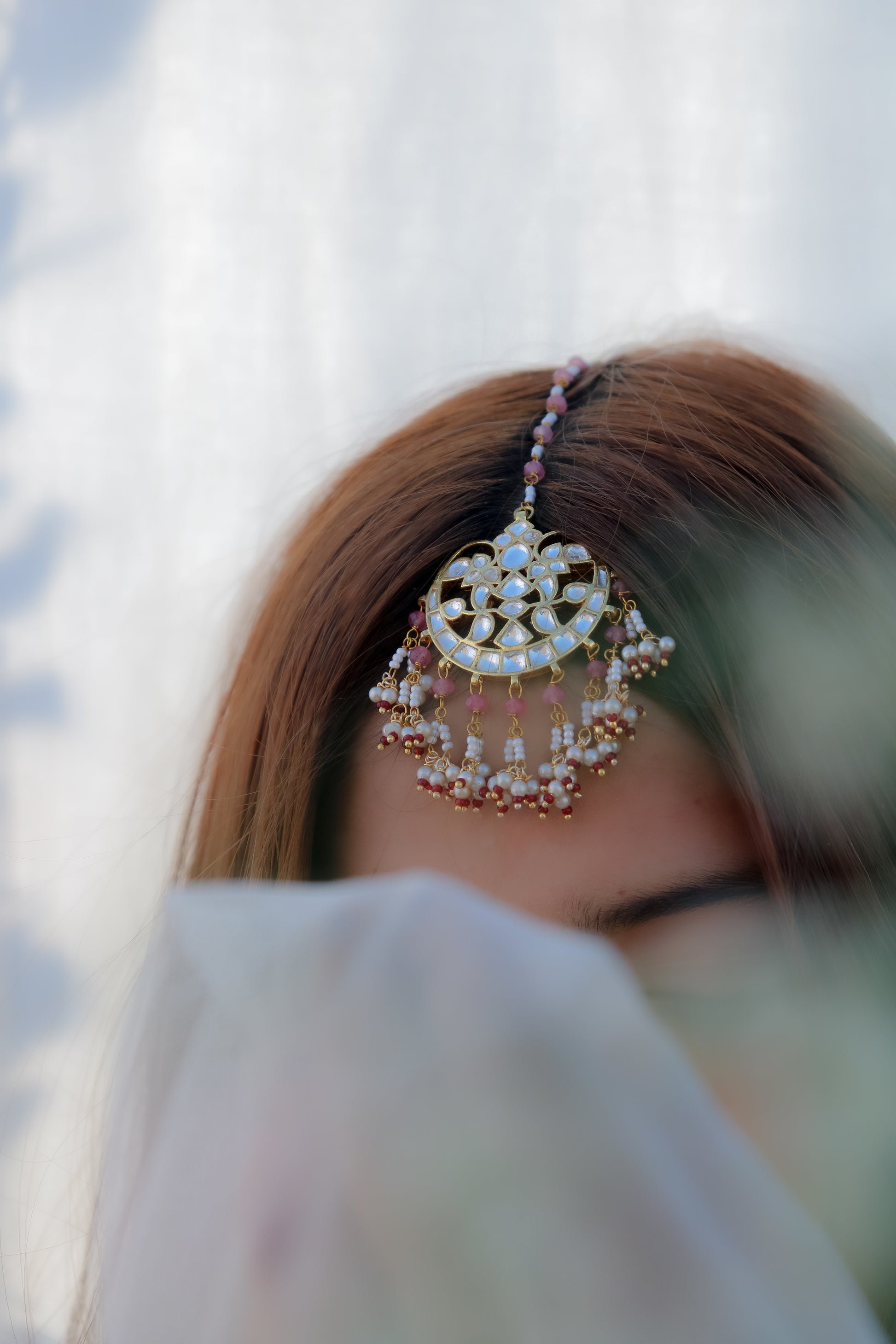 The Huma kundan tikka is encrusted with kundan and embellished with pearls. The opulent tikka can be a great accessory for your Indian festivities and weddings.