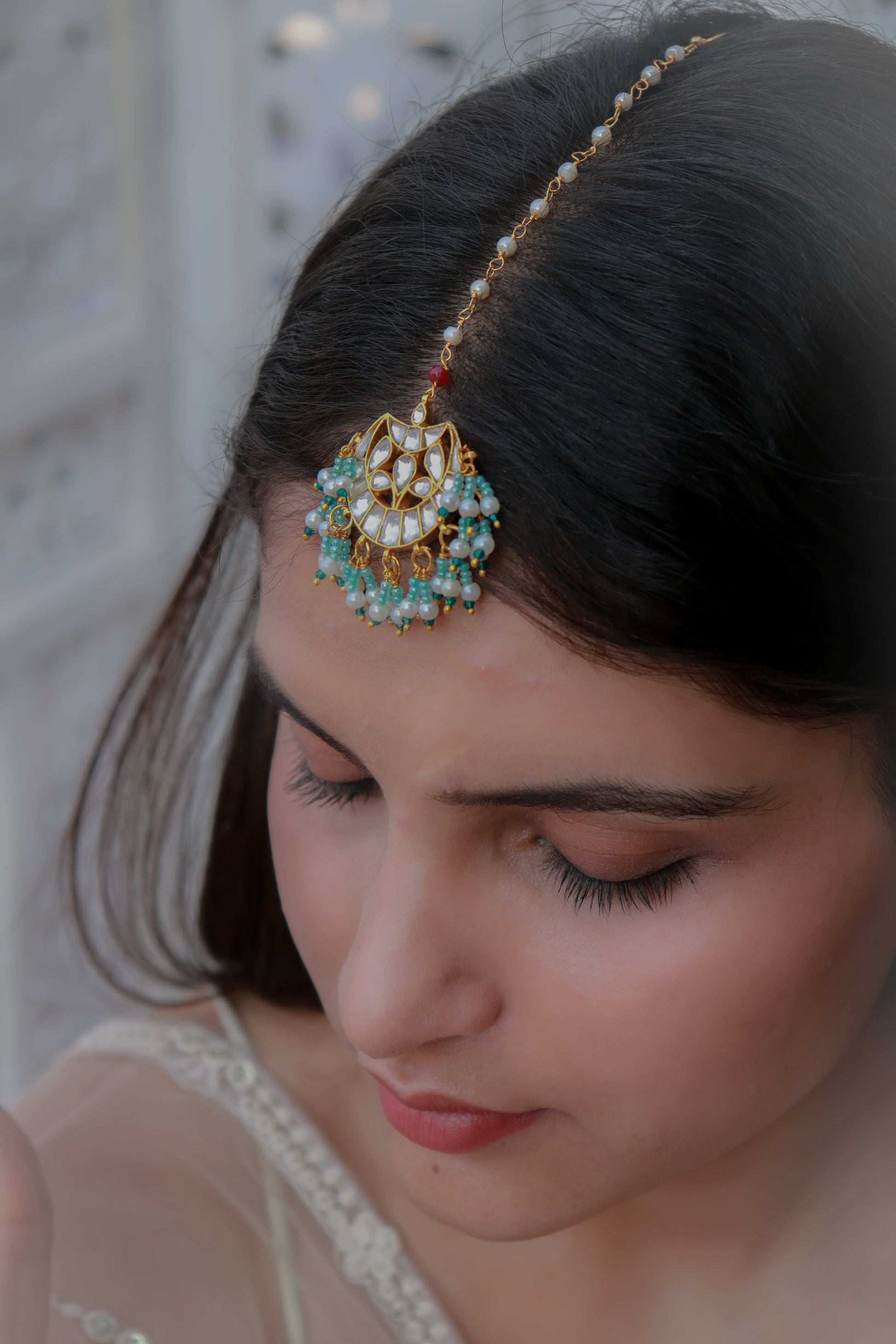 This beautiful Kundan maangtikka showcases a chand (crescent) shaped motif, adorned with delicate turquoise stone hangings. Its intricate design and vibrant color make it a stunning accessory for any traditional ensemble.