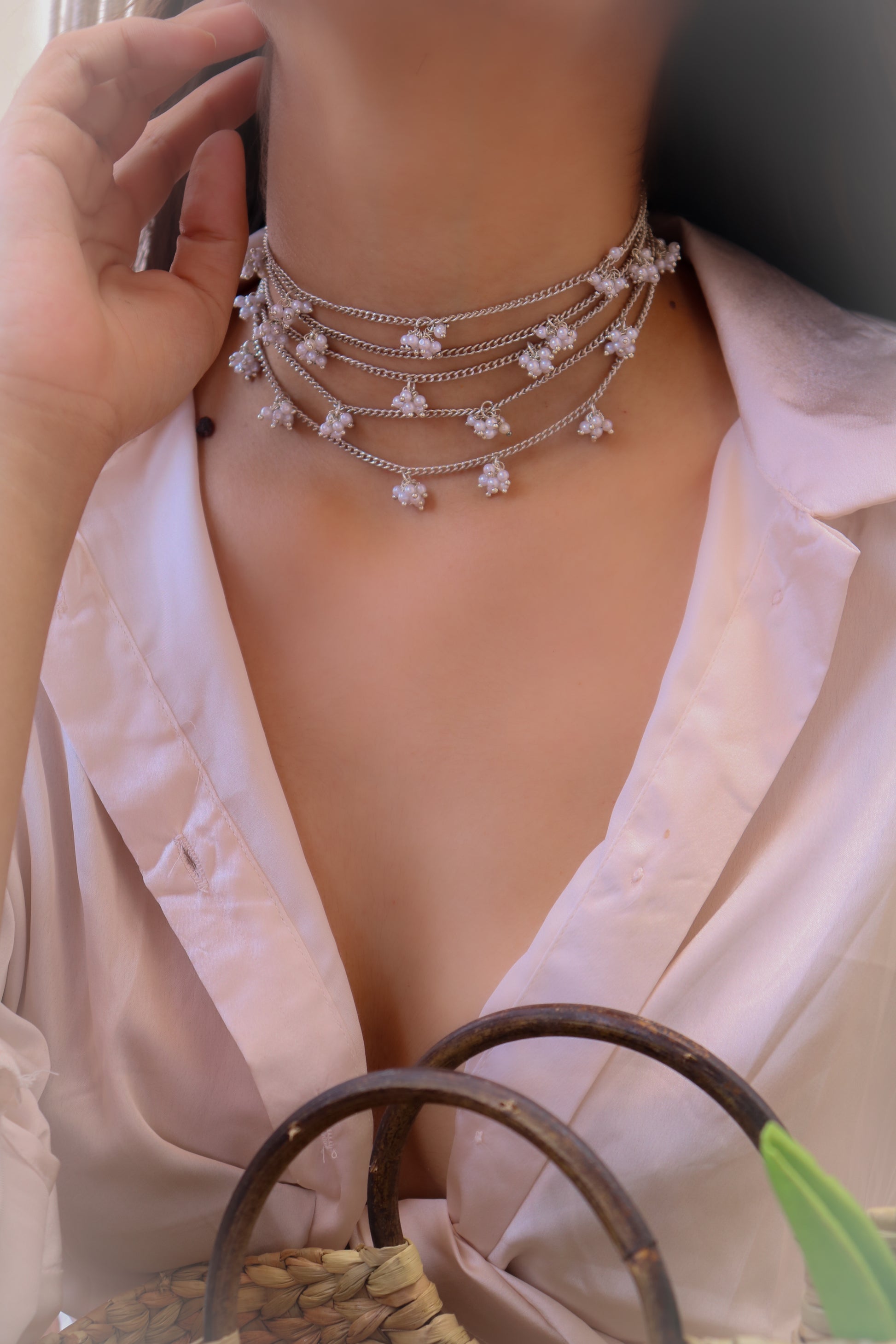 The Maura necklace features oodles of pearl tufts. The design can be an everyday staple as well.