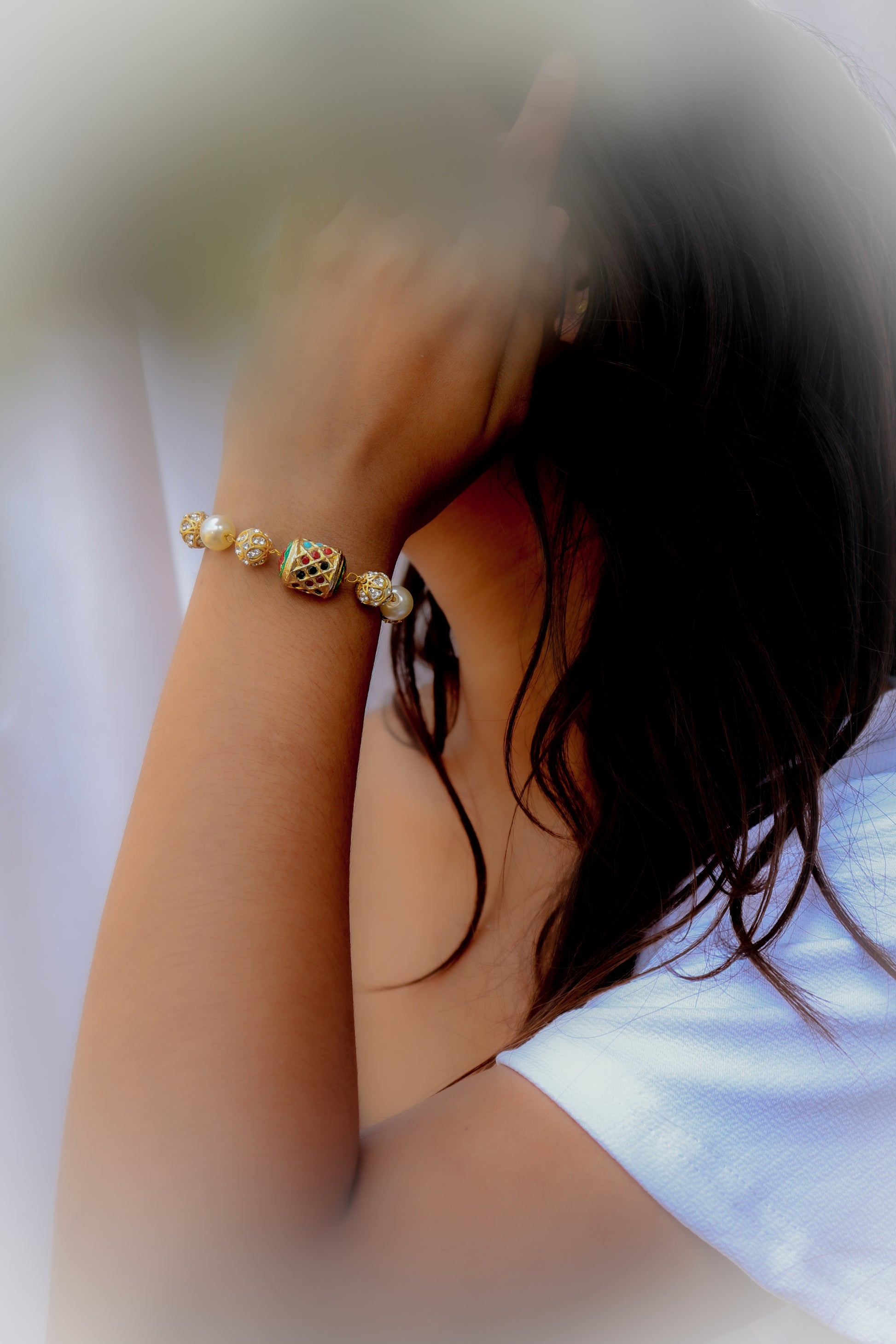A stunning bracelet made of jadau ball that displays the skill of ancient crafting. A stunning and classic piece of jewelry is produced by the union of delicate jadau work with pearls.