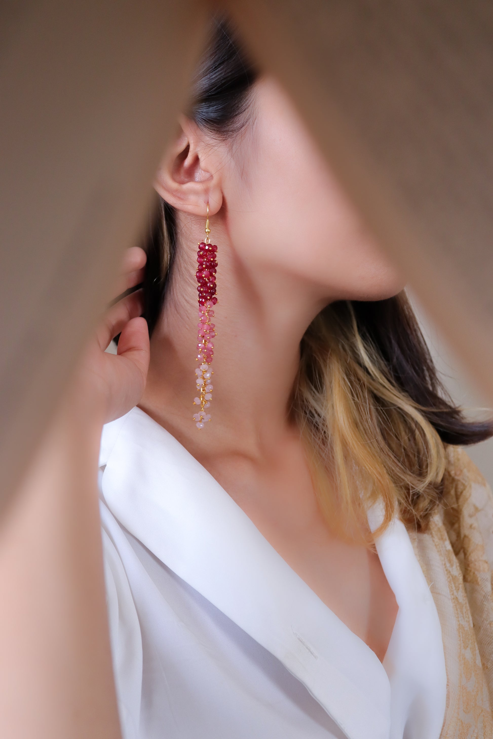The Mulberry earrings feature a long design with arresting hue and texture. The chic, one-of-a-kind design features an ombre of pink hue, that will certainly allure you.