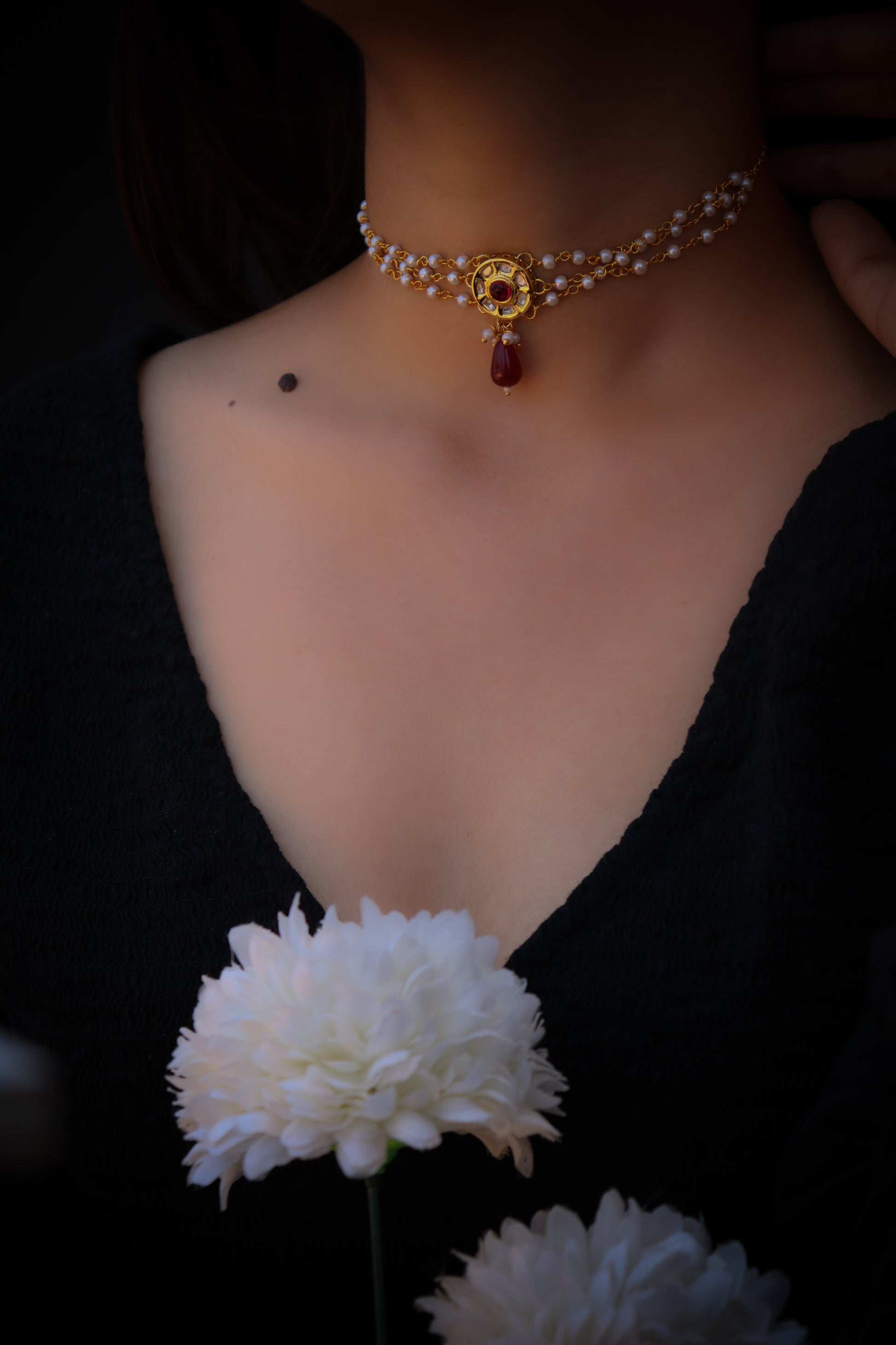 The Adhira choker is a minimalist design with rich red hue. The design features kundan encrusted in a gold plated base and with accents of red