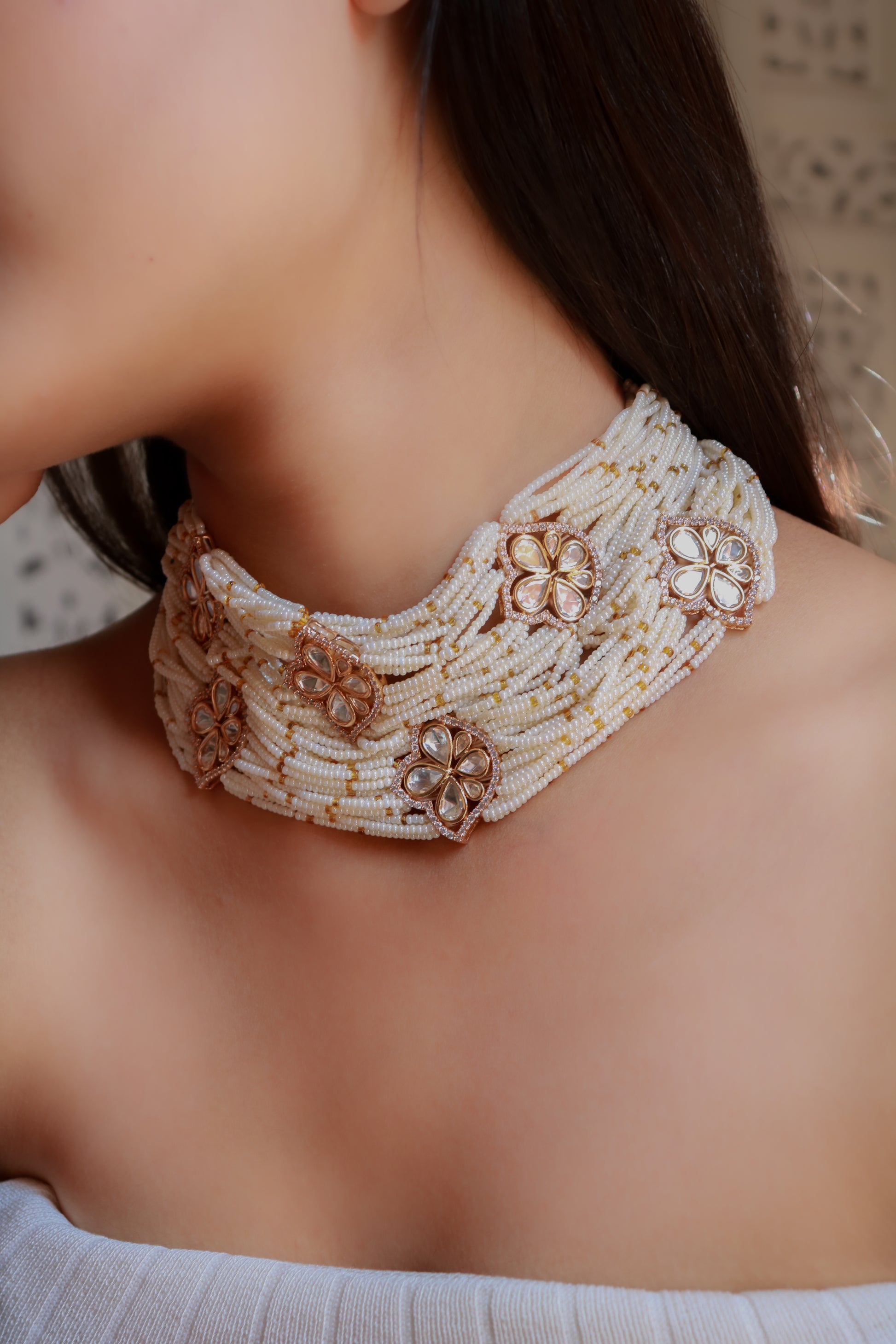 This beautifully handcrafted necklace showcases unique polki tikdis majestically strewn amidst small pearls, creating a captivating and elegant design. A perfect statement piece that reflects timeless artistry and sophistication.