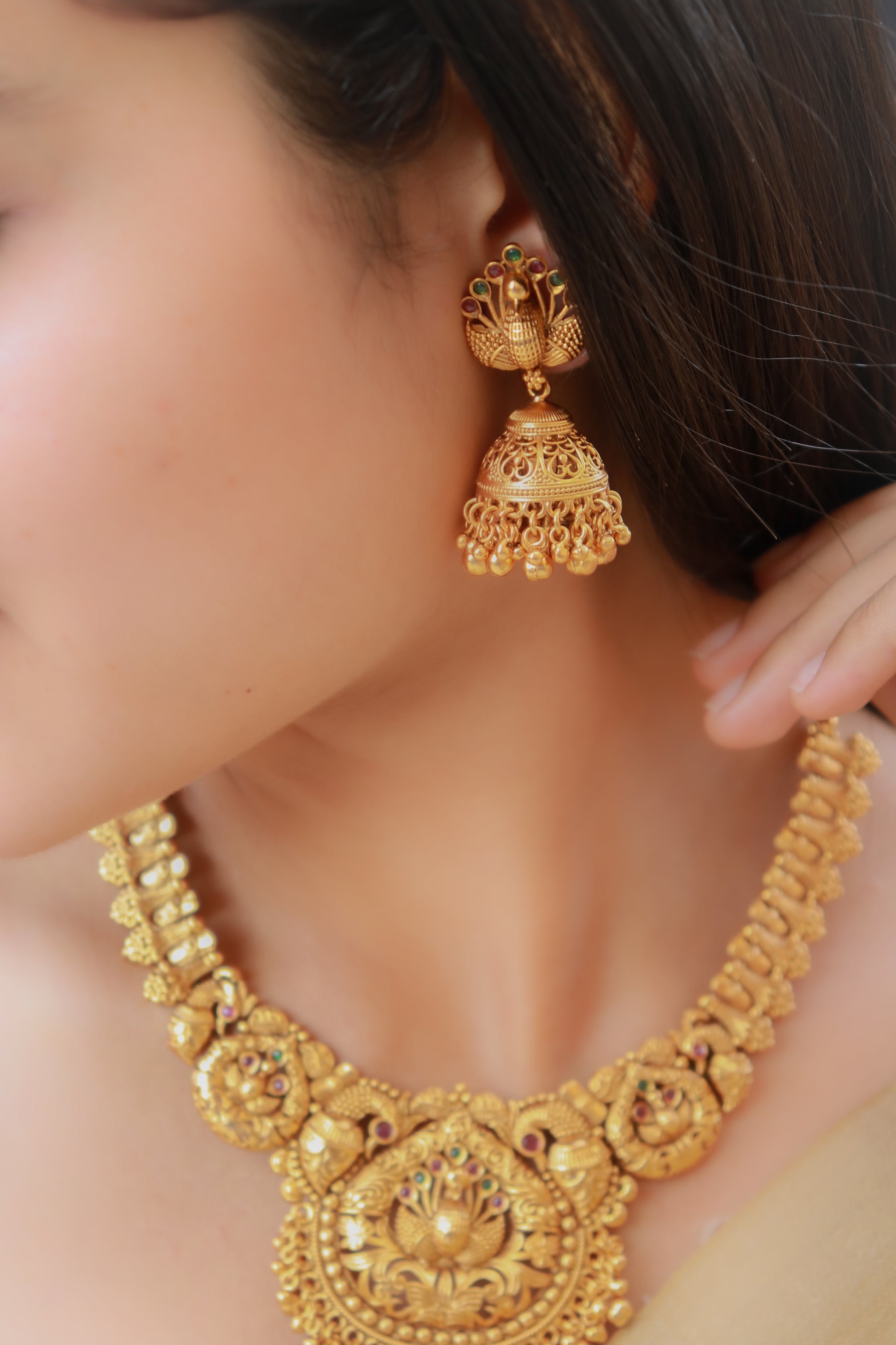 This enchanting temple-work necklace features intricate designs that echo ancient artistry, adorned with divine motifs and stunning details. It radiates a timeless charm, perfect for elevating any traditional or festive attire.