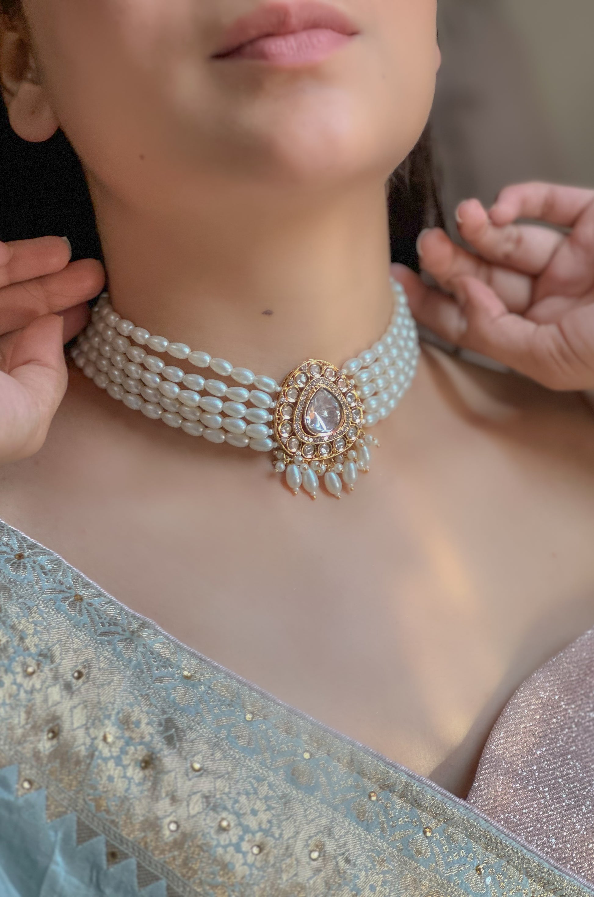 An elegant pearl choker necklace featuring a striking Polki-designed centerpiece. The intricate Polki unit adds a touch of regal charm, beautifully complementing the delicate pearls, creating a timeless and sophisticated piece of jewelry.