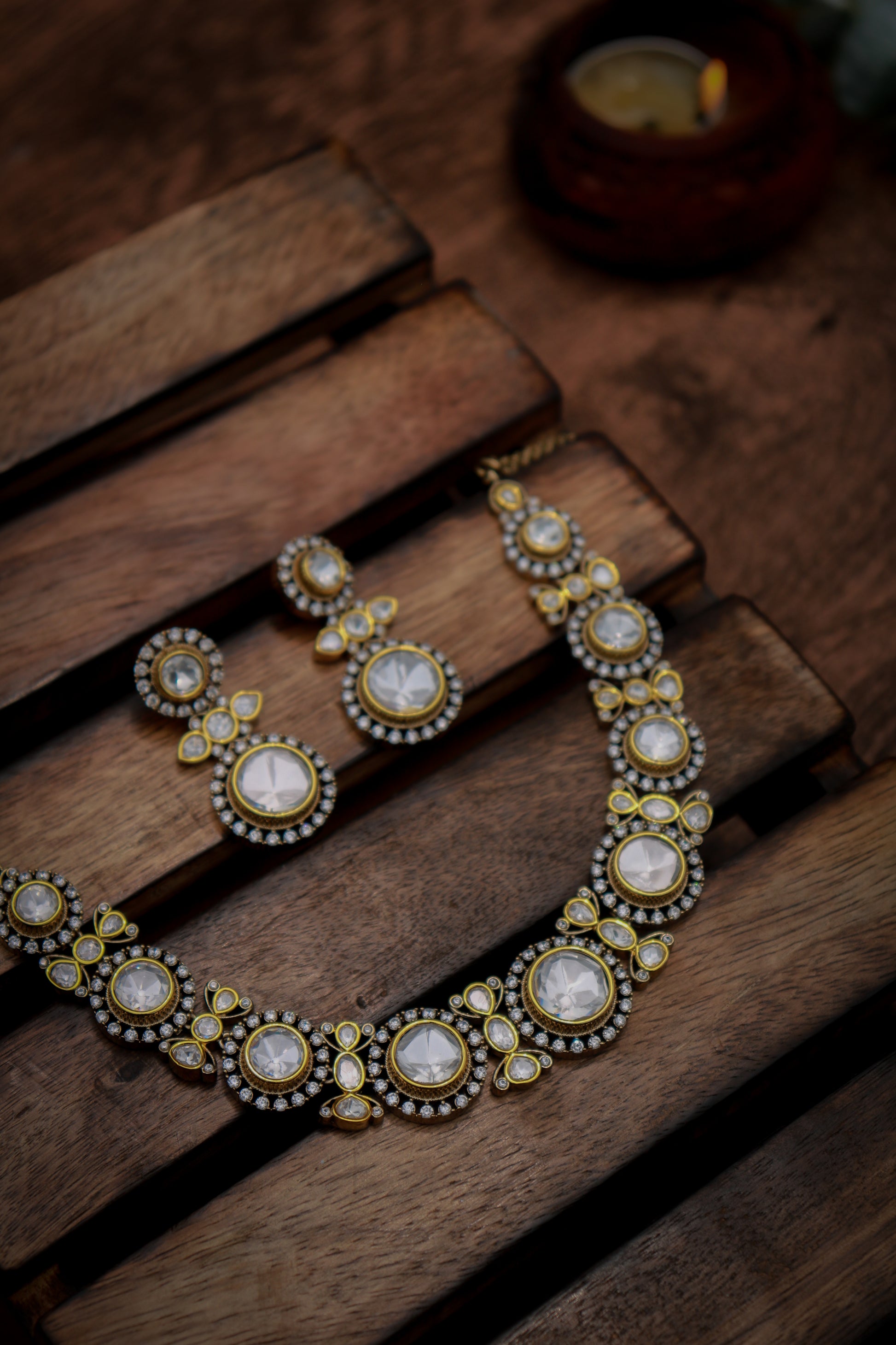 A beautifully designed Polki necklace featuring circular Polki units arranged in a stunning pattern. Each unit sparkles with timeless elegance, creating a sophisticated and eye-catching piece that exudes classic charm.