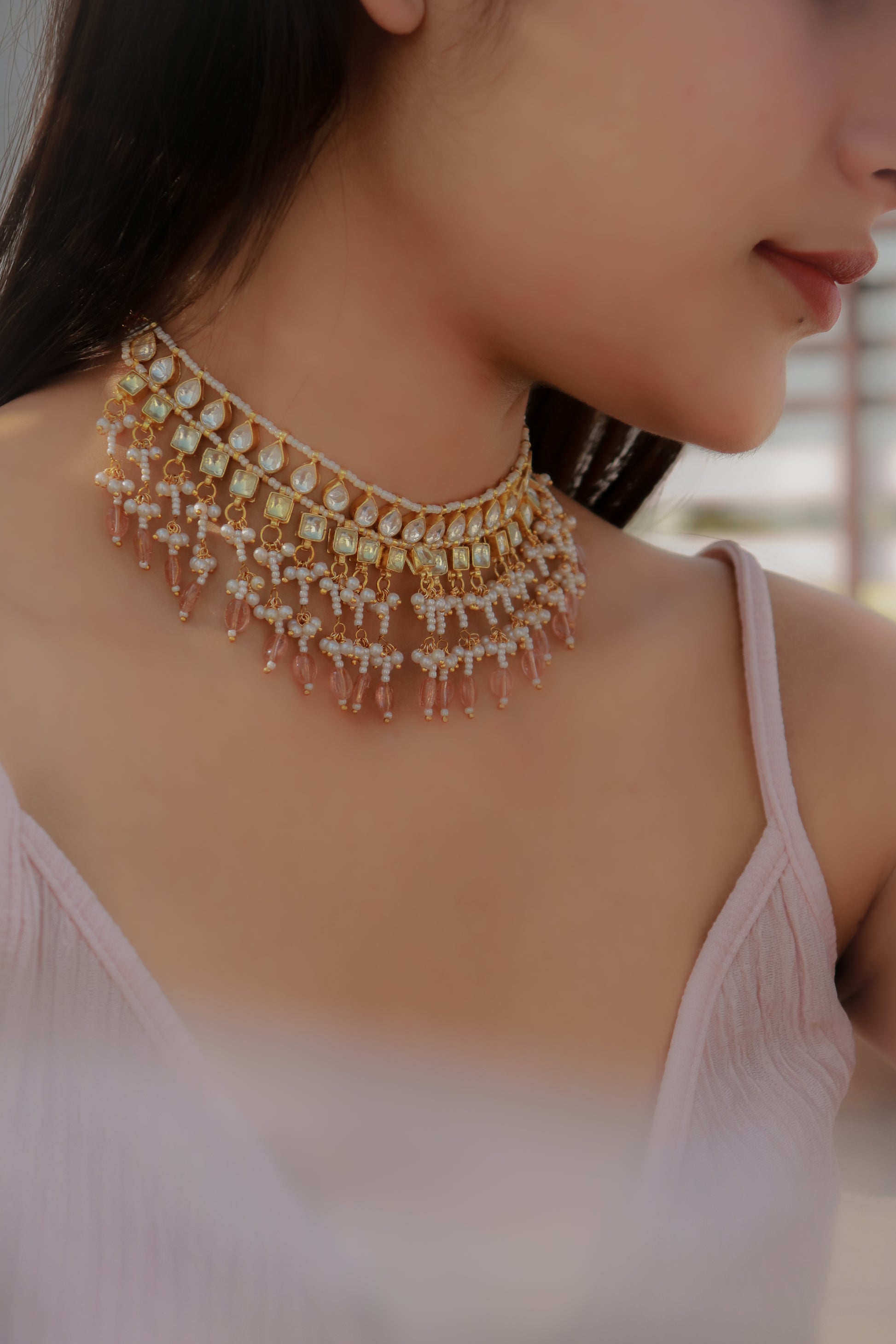 This stunning handcrafted necklace features radiant Kundan units, adorned with delicate pearl and mauvish pink trinkets. A perfect blend of elegance and charm, it adds a touch of timeless sophistication to your style.