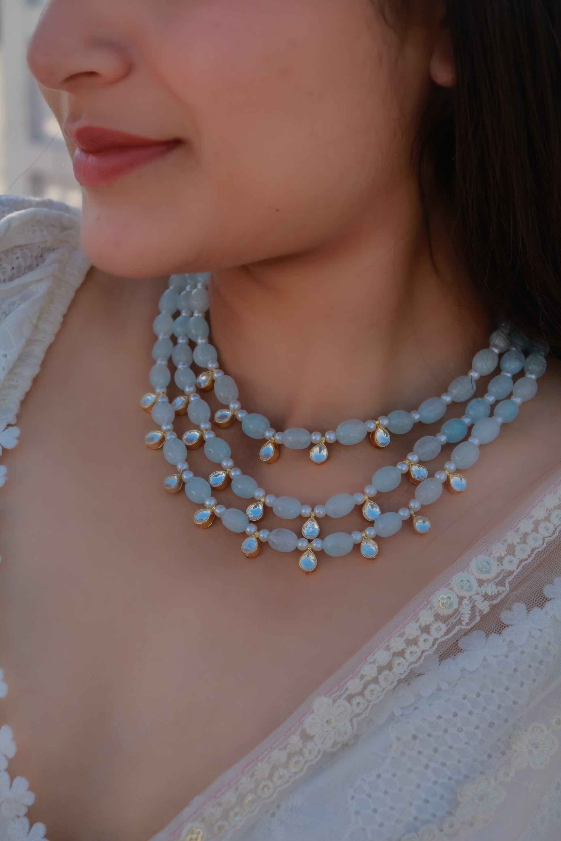 This exquisite handcrafted necklace showcases radiant Kundan units, beautifully strung with mint-hued semi-precious stones. A harmonious blend of elegance and freshness, it’s the perfect accessory for a timelessly graceful and sophisticated look.