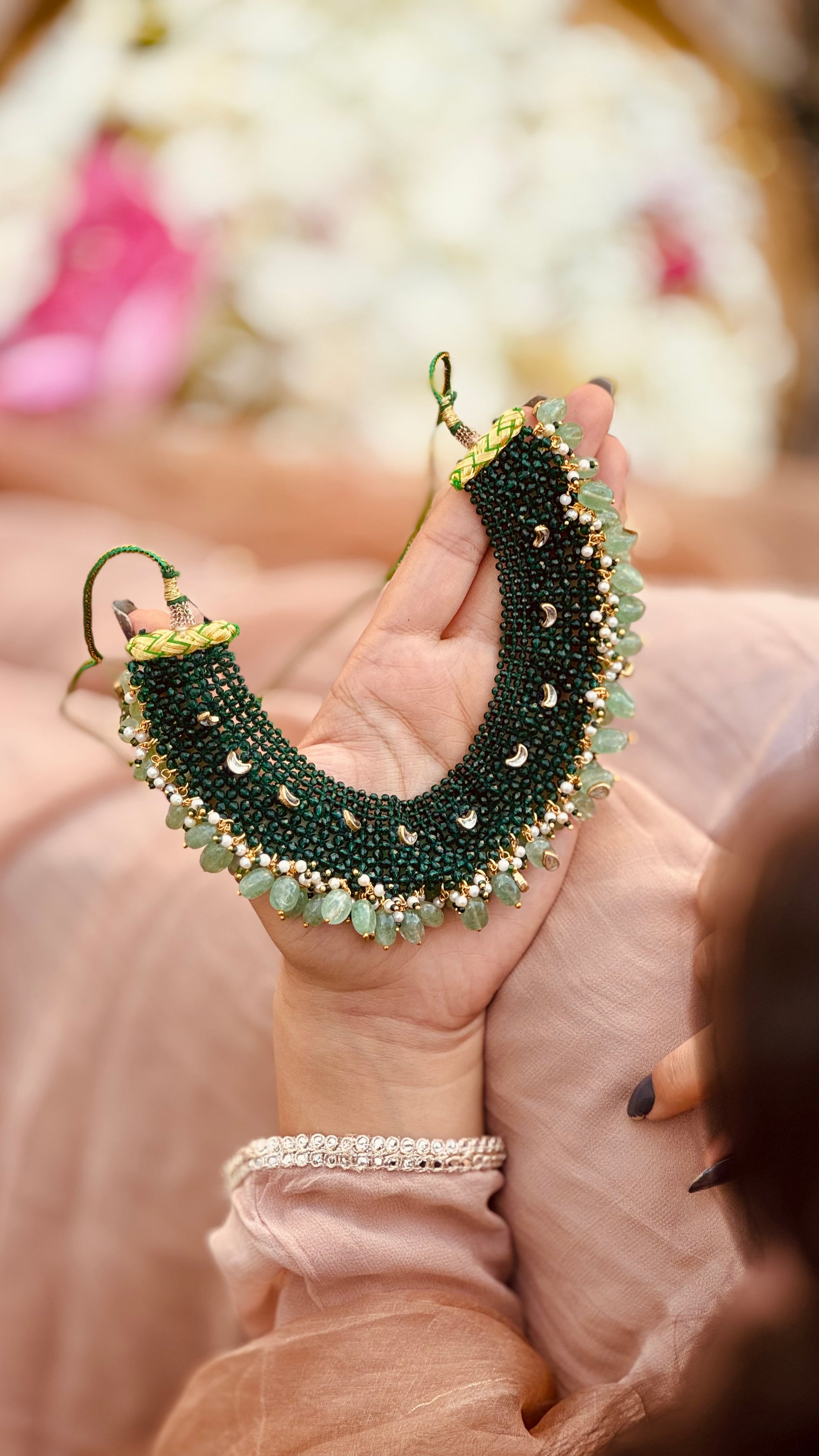 A captivating necklace crafted with forest green beads, adorned with mint semi-precious stone hangings and white-green pearl pichais. Delicate kundan chand units gleam upon the green strands, enhancing its radiance and charm, making it an enchanting statement of elegance.