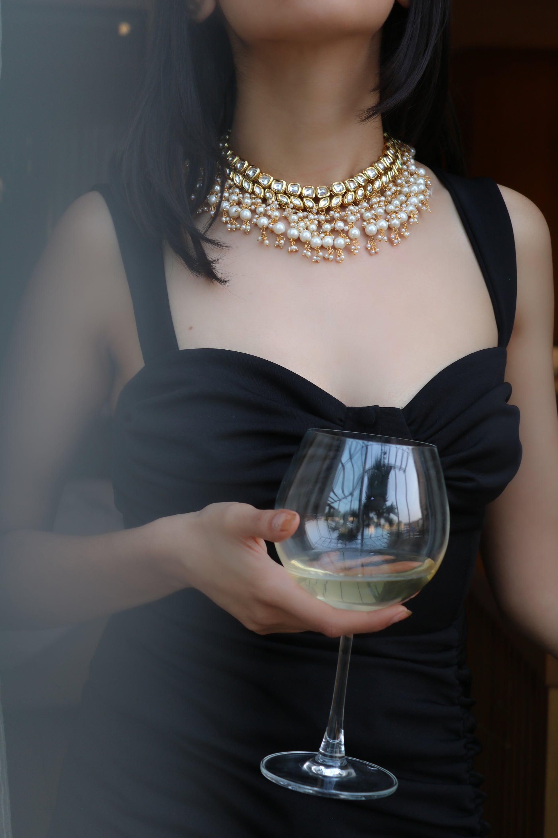 The Urvi kundan necklace is a beautiful play of shapes. The opulent design has kundan lined with pearl accents.