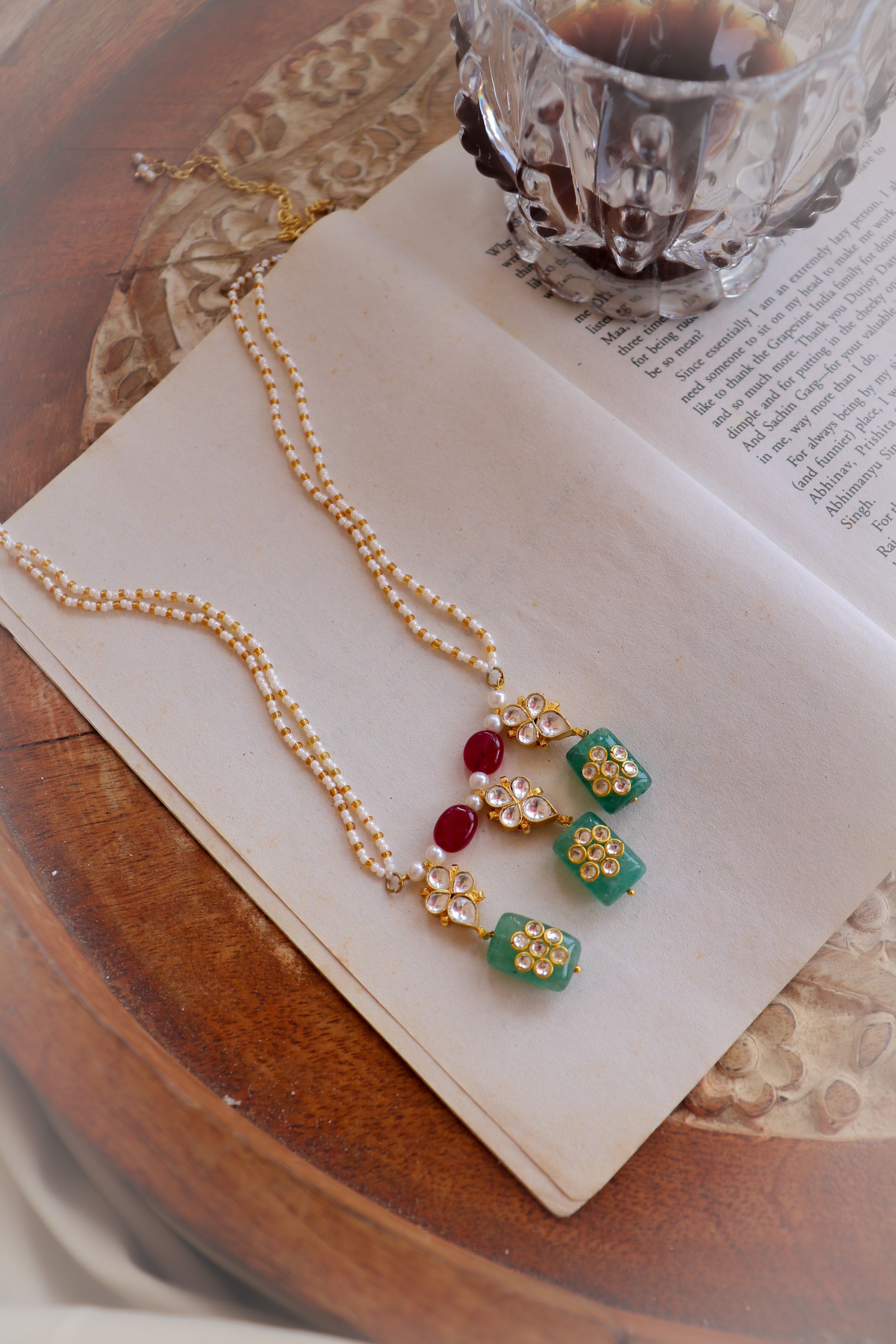 The Ningrat necklace is a beautiful design with pretty hues. The kundan design is adorned with red stones, finished off with green stones. The design hangs through a pearl strewn chain.