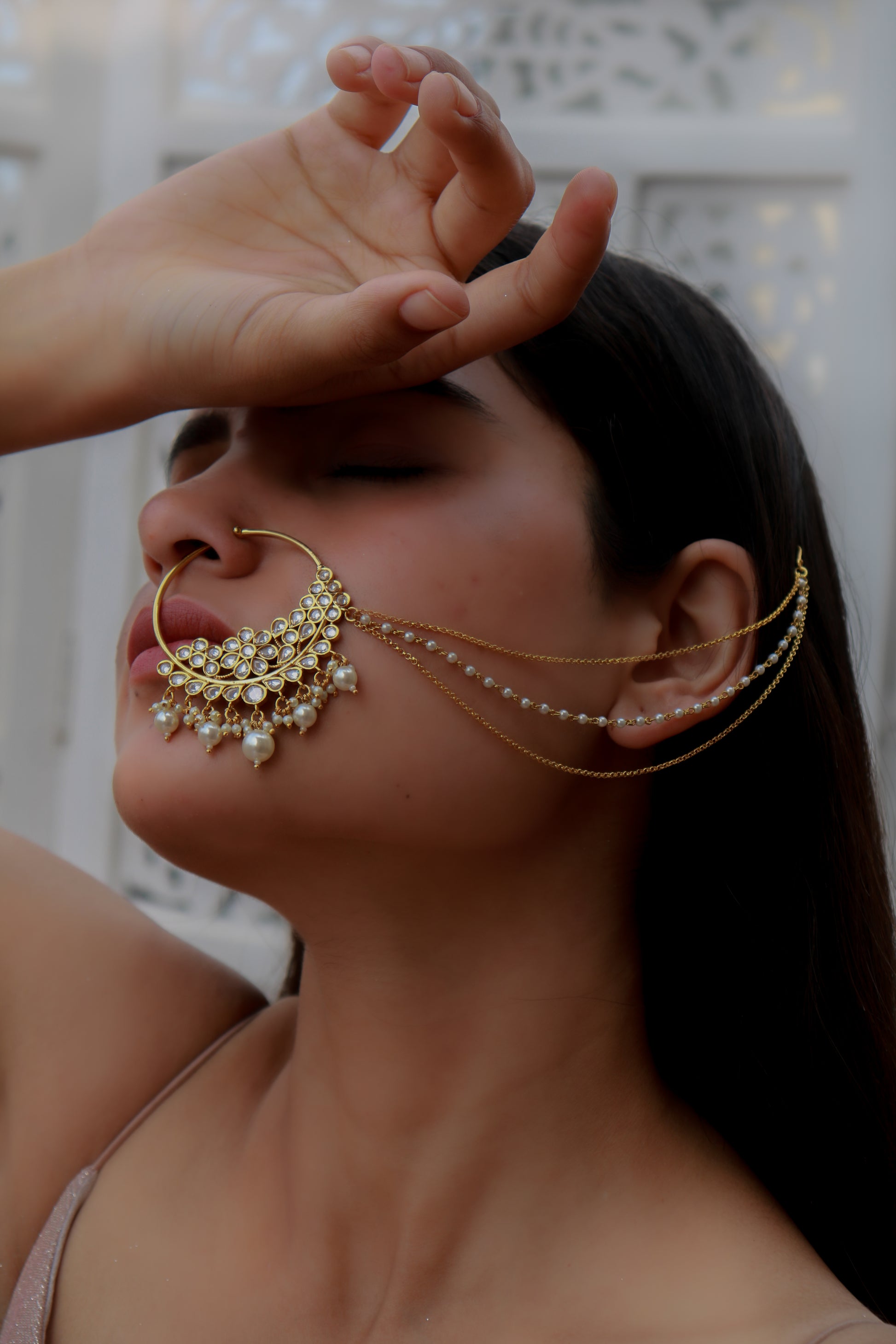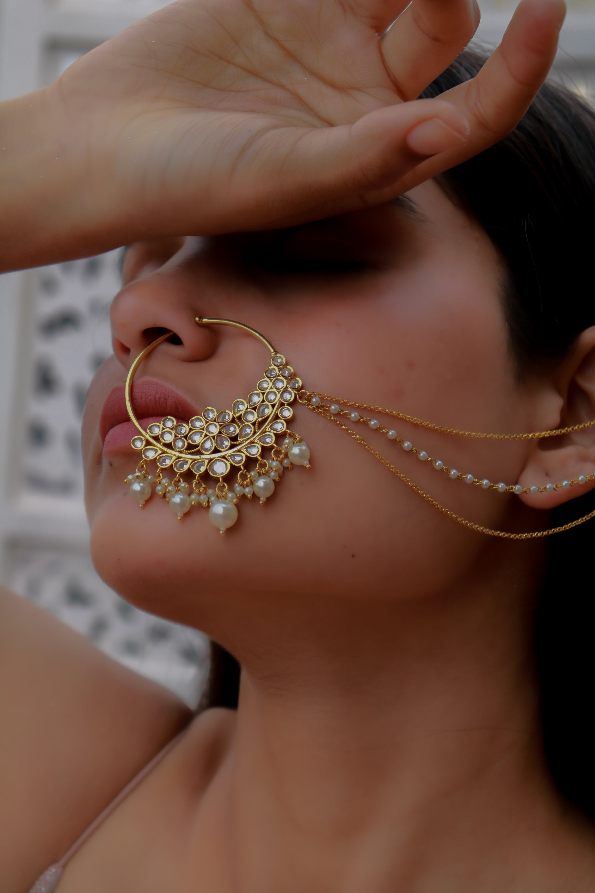 This stunning Kundan nosepin features subtle pearl hangings and three elegant strings—one of lustrous pearls and two delicate gold chains. Its graceful design radiates sophistication, perfect for a regal, traditional look.