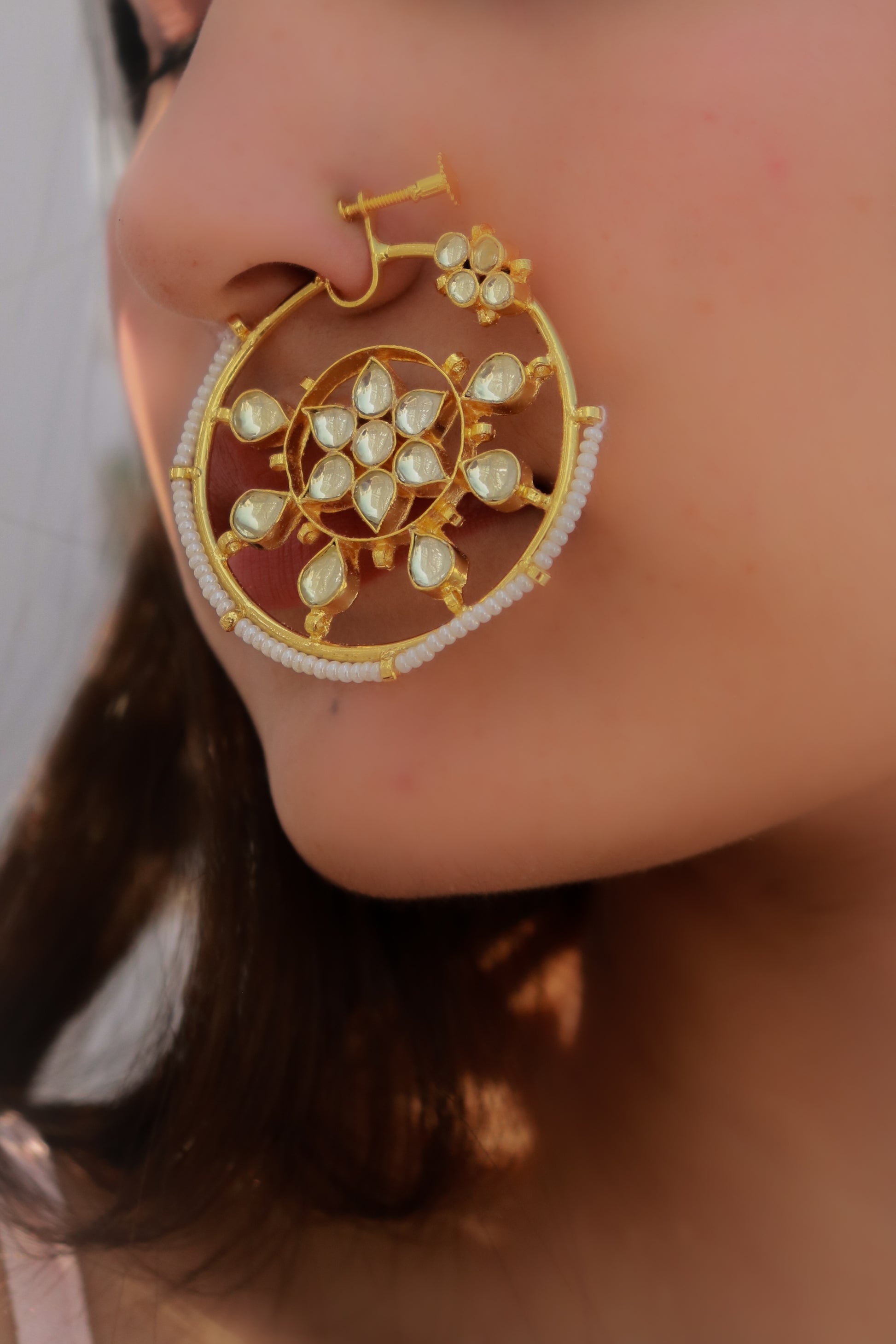 Radiating timeless elegance, this regal kundan nosepin features intricate detailing, exuding sophistication and is perfect for elevating any occasion.