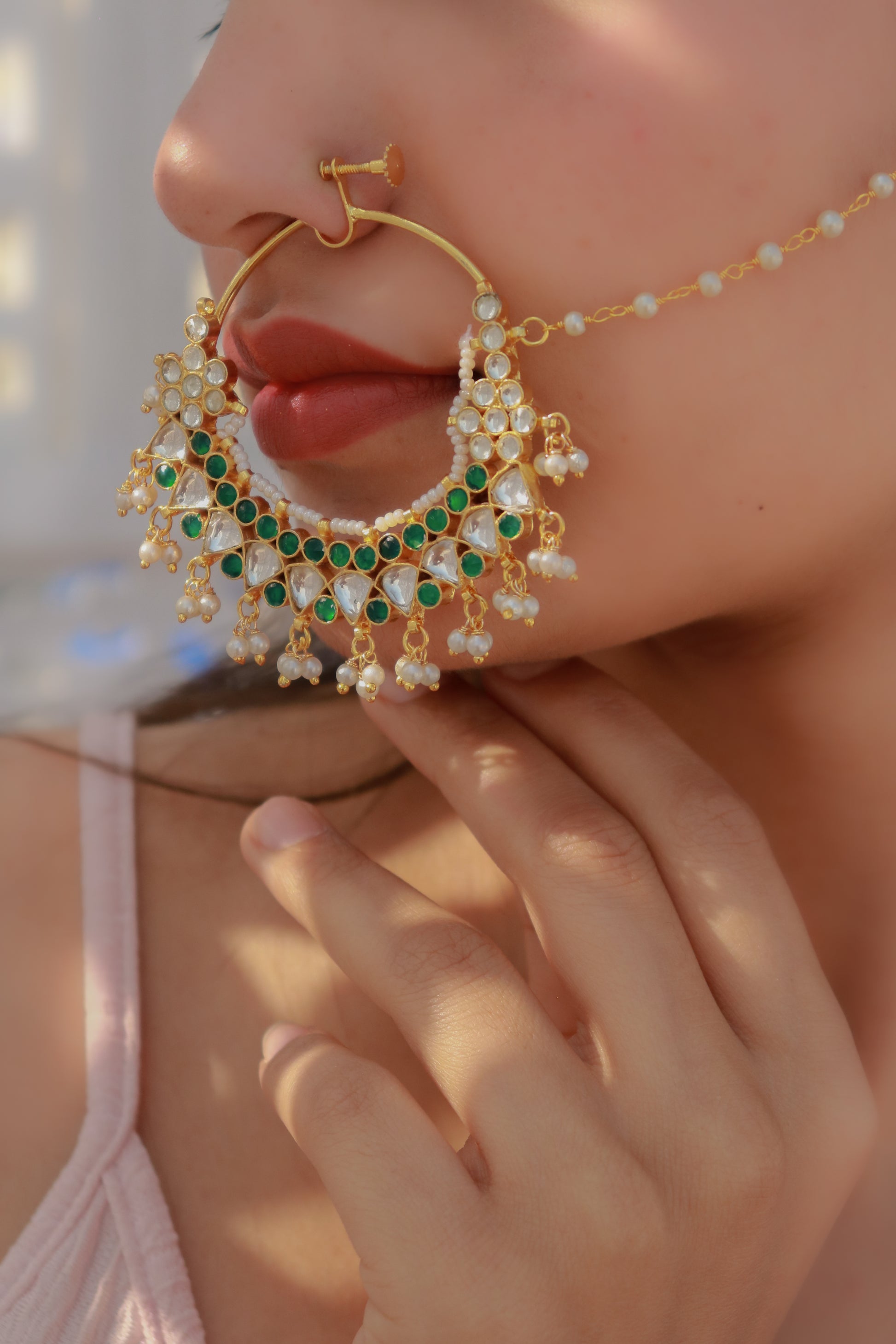 Oormi kundan nosepin is a beautiful piece of traditional Indian jewelry, combining the artistry of kundan with a vibrant green color, giving the nosepin a distinctive and lively appearance.