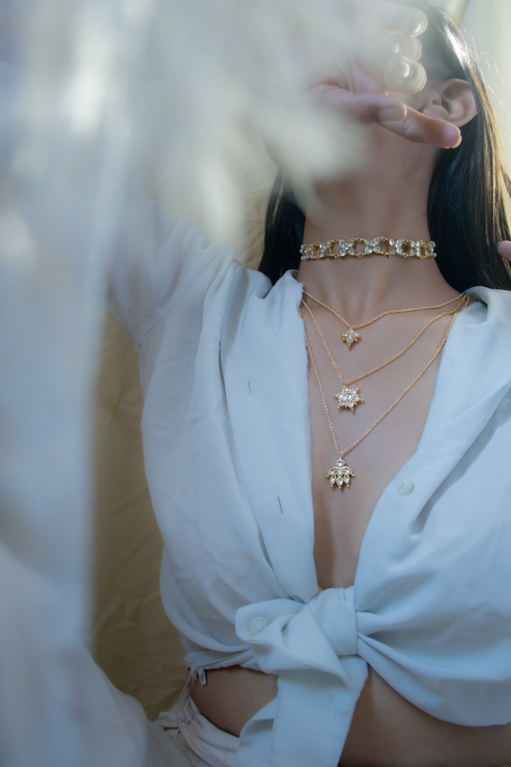 The Rumani necklace leans heavily towards the boho aesthetic, with its minimal kundan pendants. The choker is encrusted with kundan and is the heart of the design.