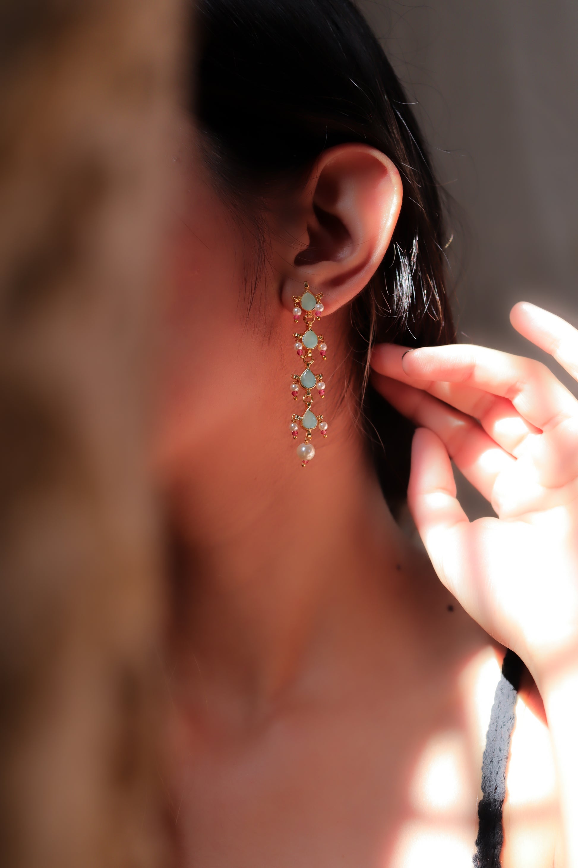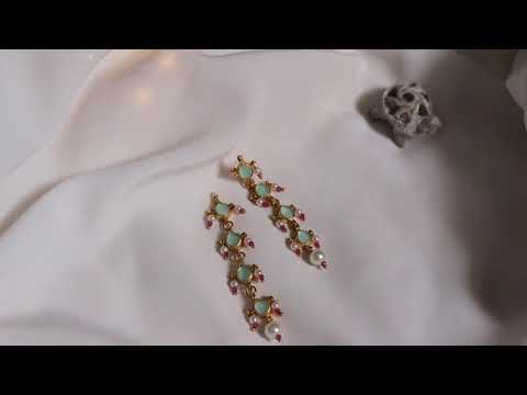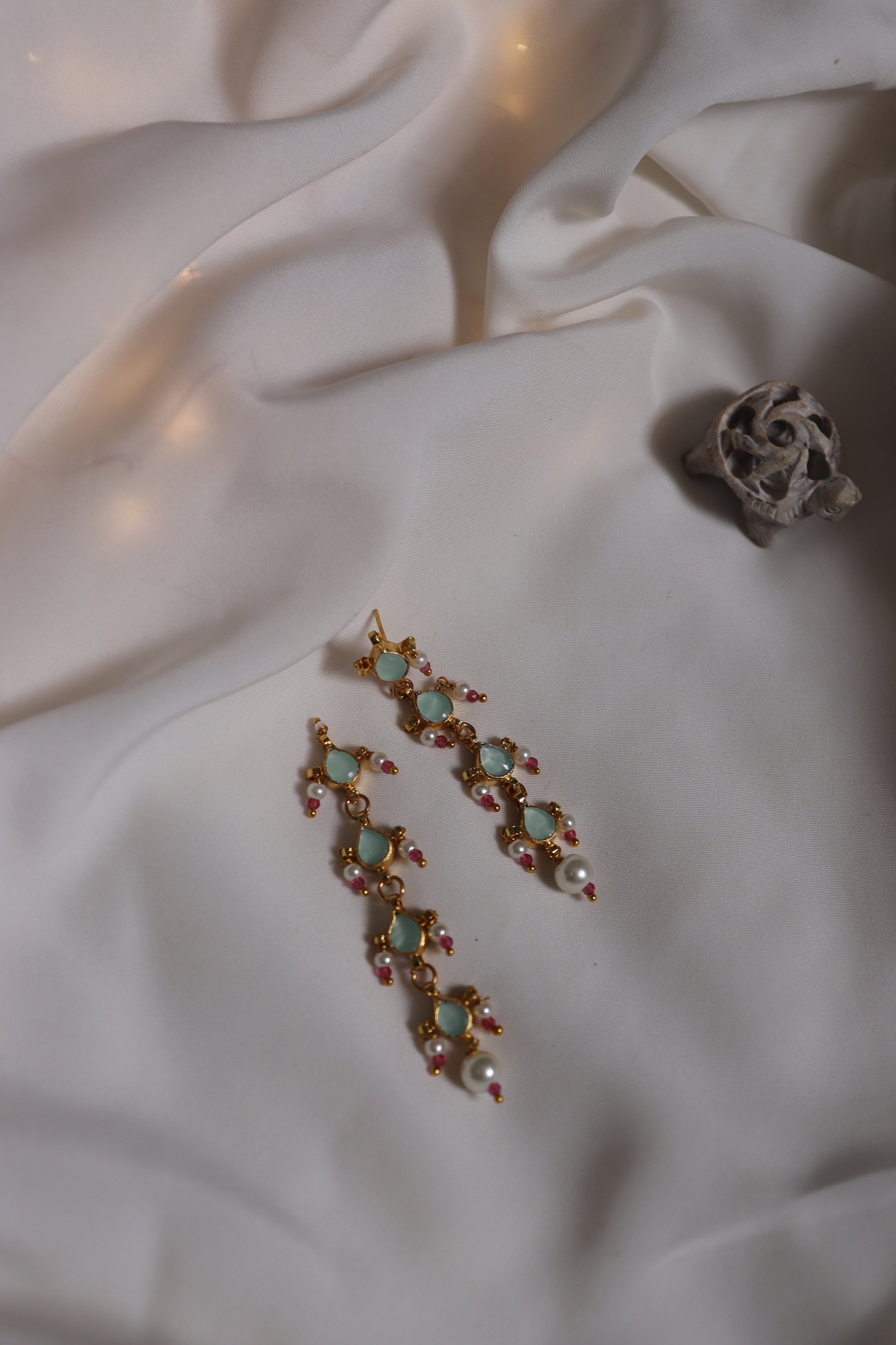 These playfully vibrant danglers offer great movement with its long dangling lines of turquoise stones. The subtle touch of pink lends the design a beautiful charm.