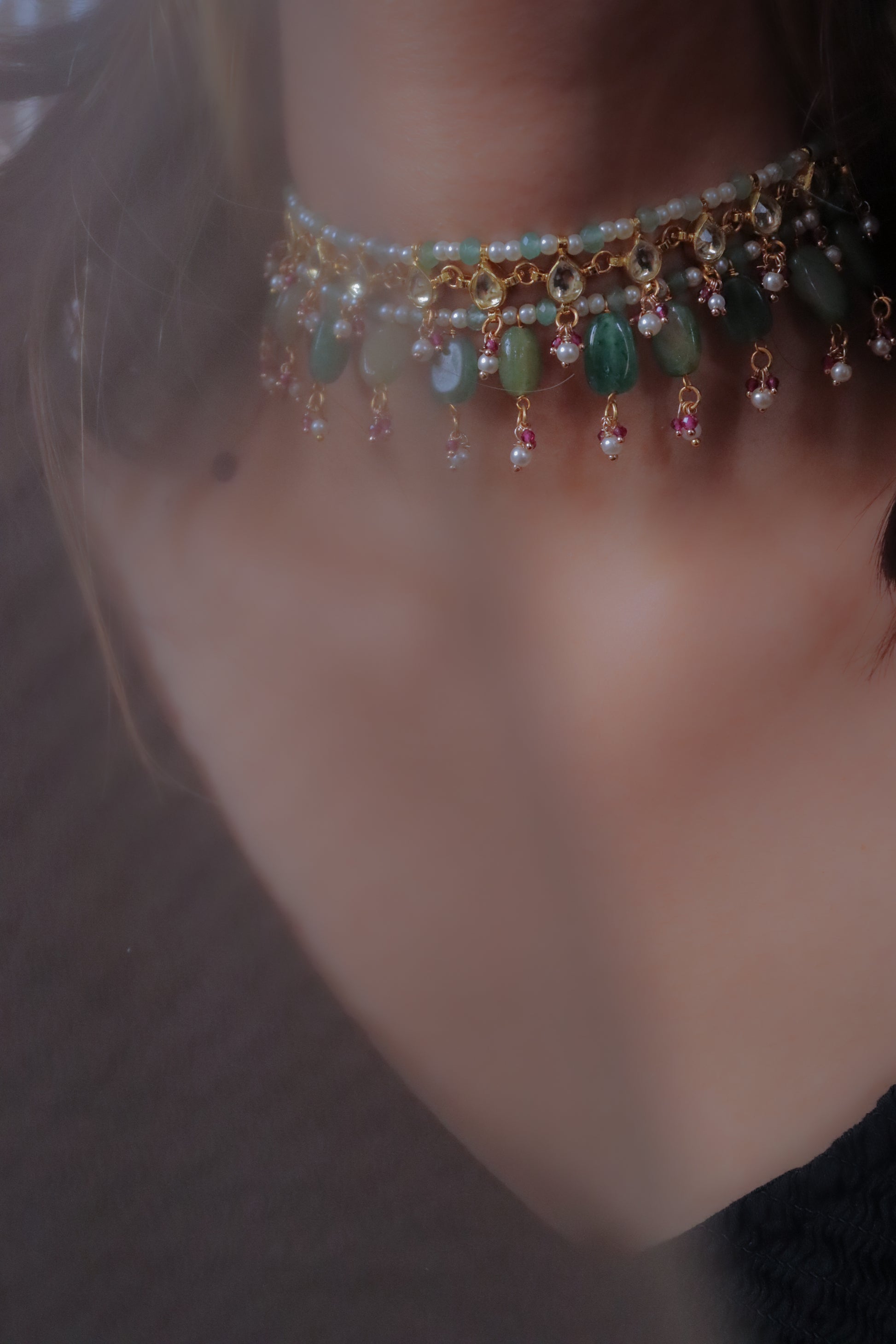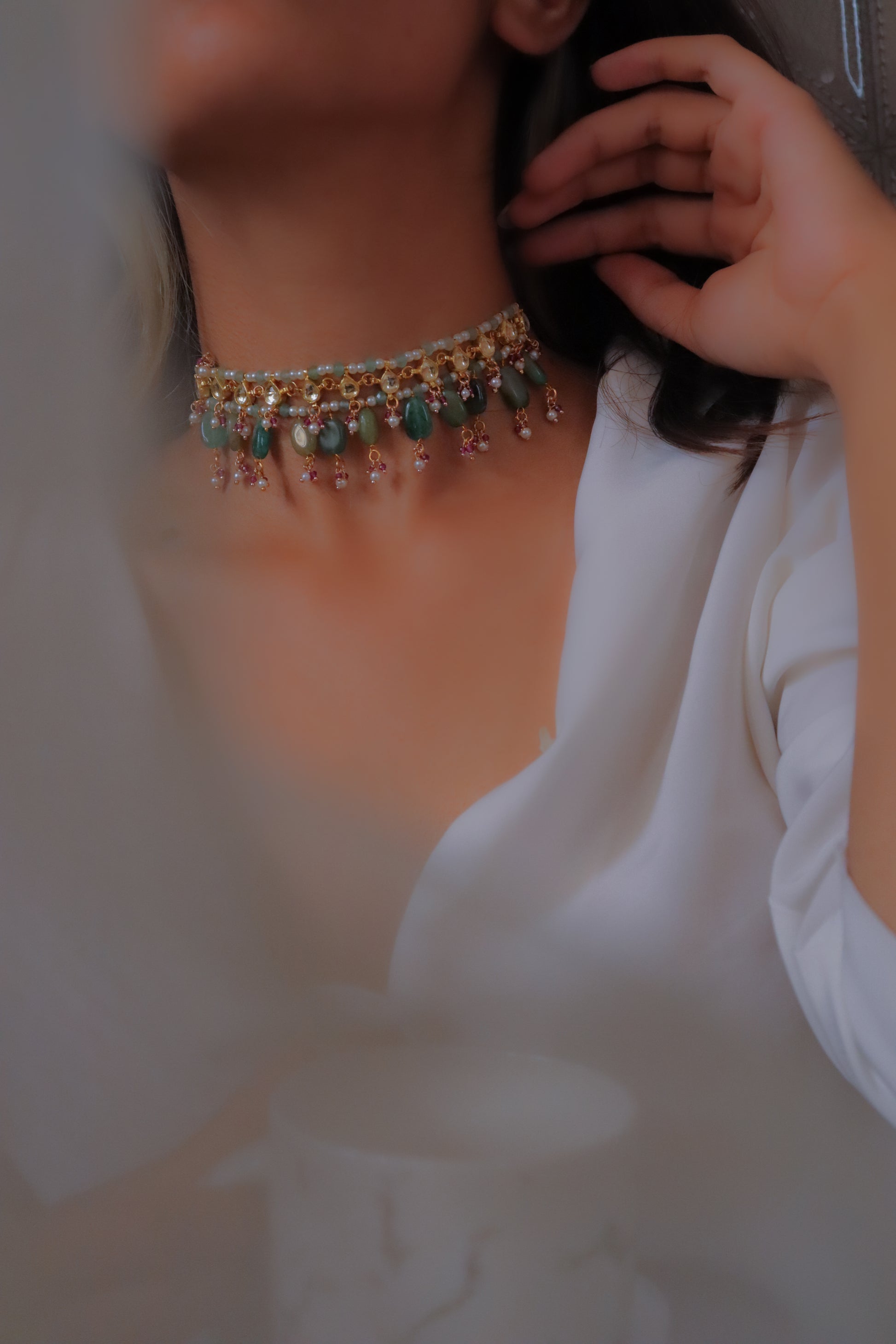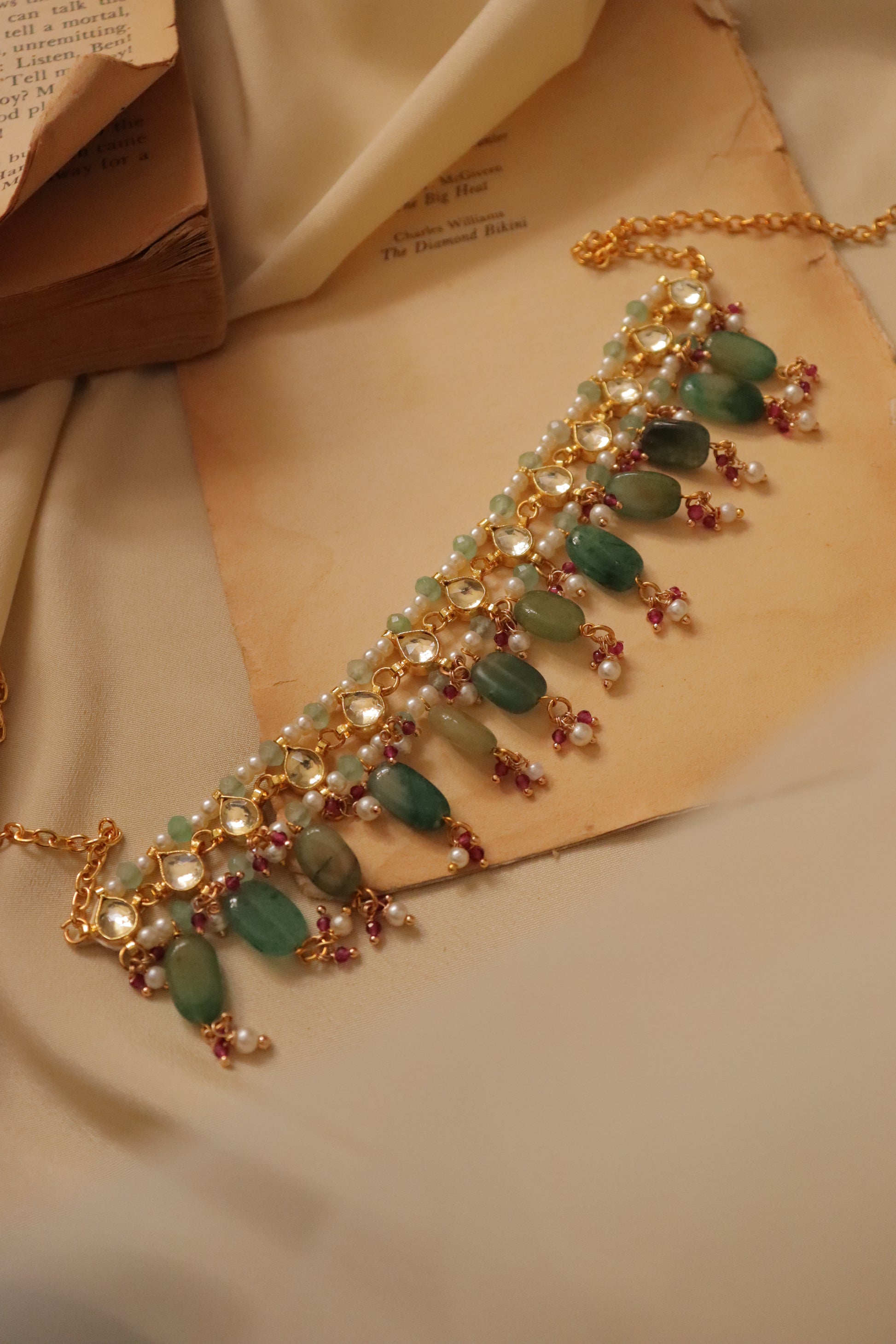 This perfect amalgam of traditional and contemporary elements featured in this necklace creates the perfect contemporary jewel. The necklace is finished off with kundan trinkets embellished with pearls and semi-precious stones.